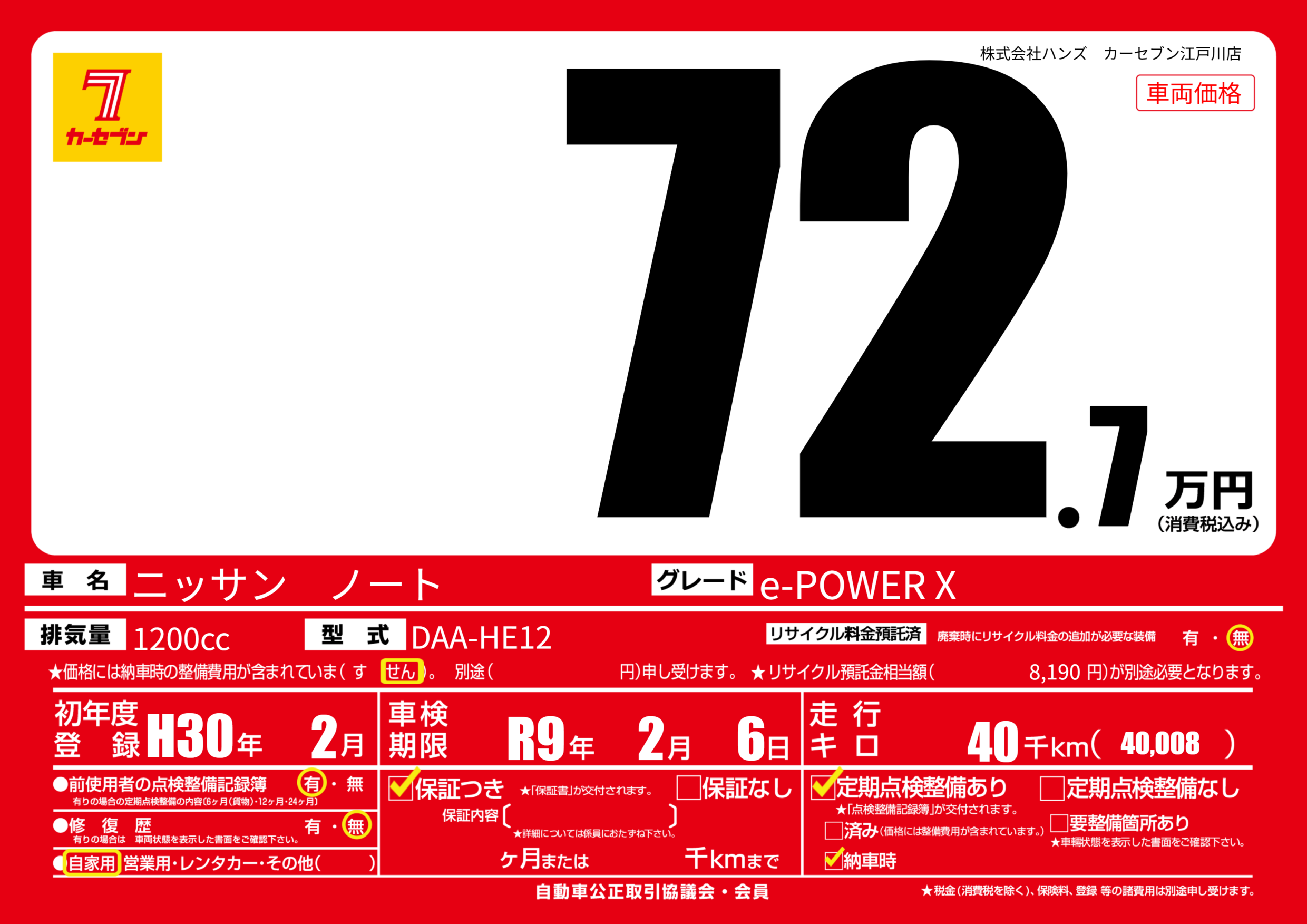| 車名 | ニッサン ノート | グレード ミッション 排気量 |
