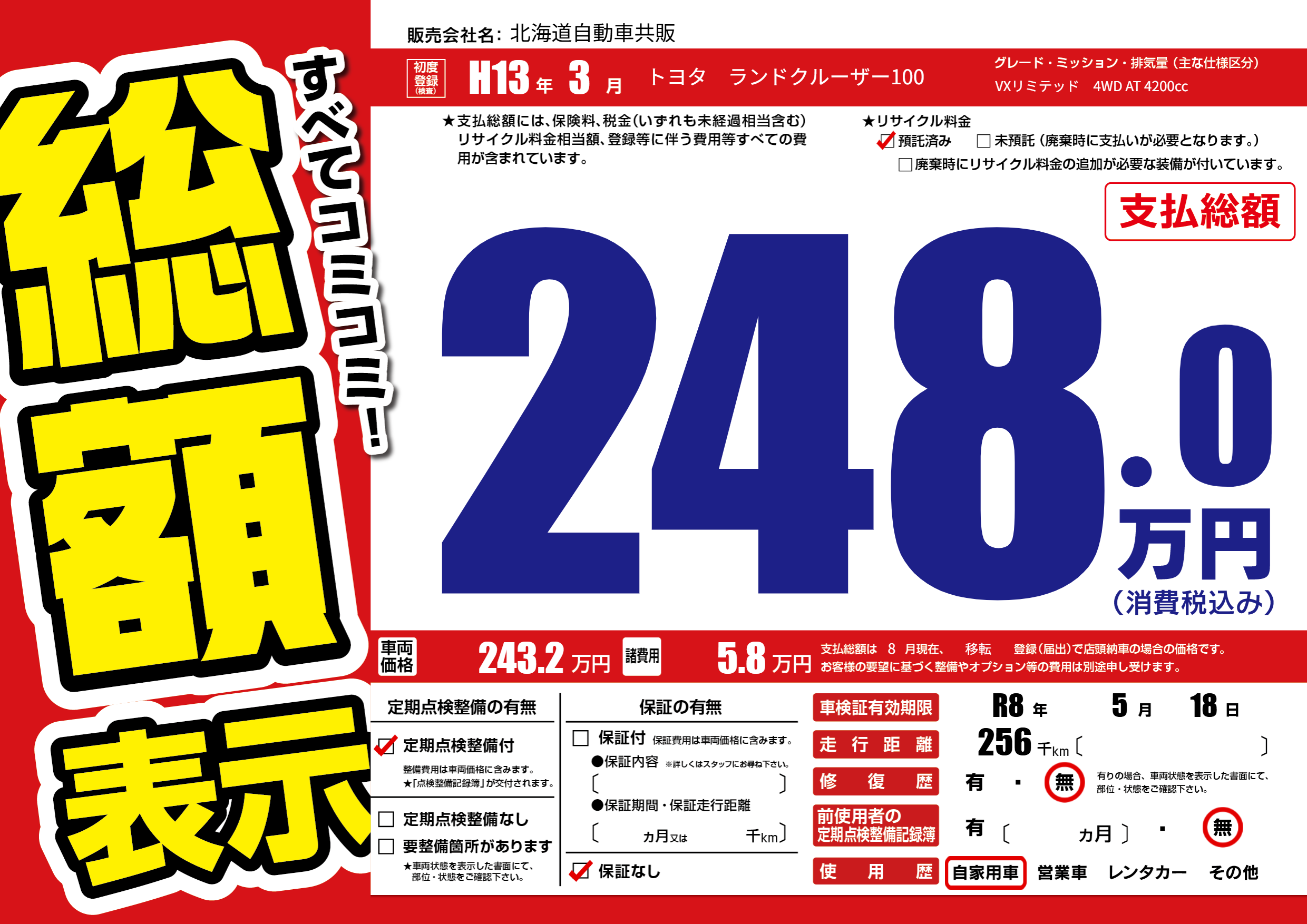 | 車名 | トヨタ ランドクルーザー100 | グレード ミッション 排気量 |
