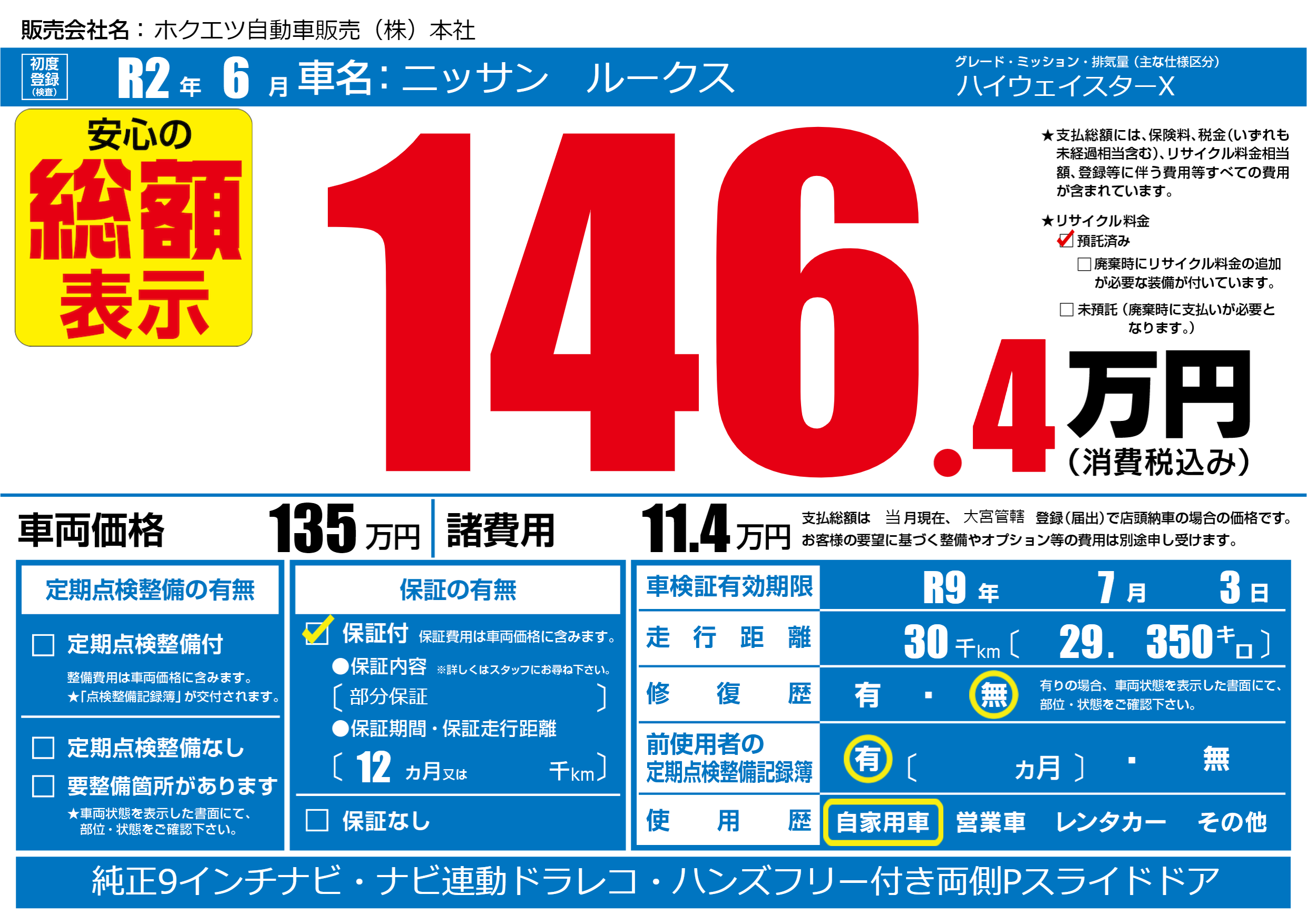 | 車名 | ニッサン ルークス | グレード ミッション 排気量 |