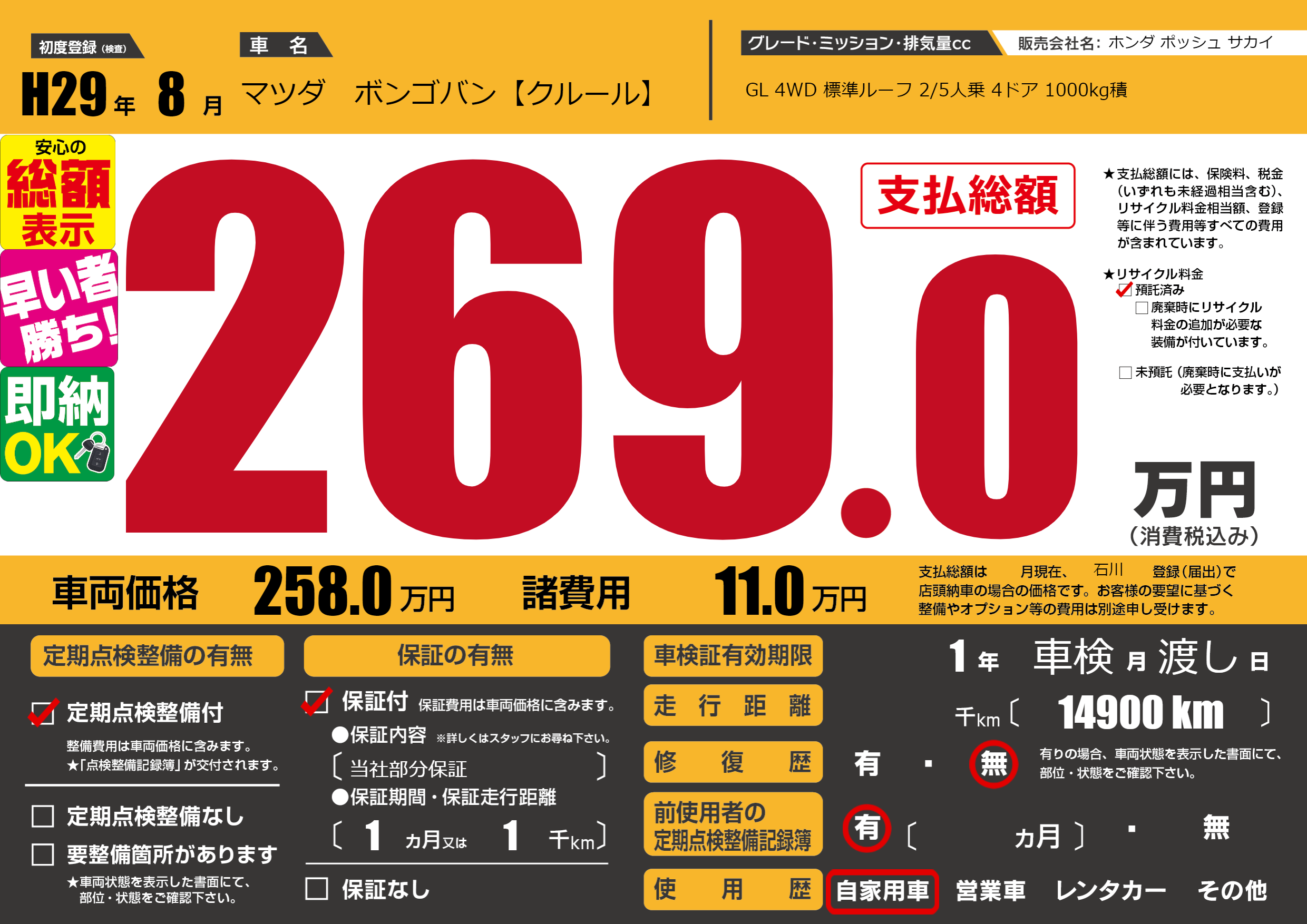 | 車名 | マツダ ボンゴバン【クルール】 | グレード ミッション 排気量 |
