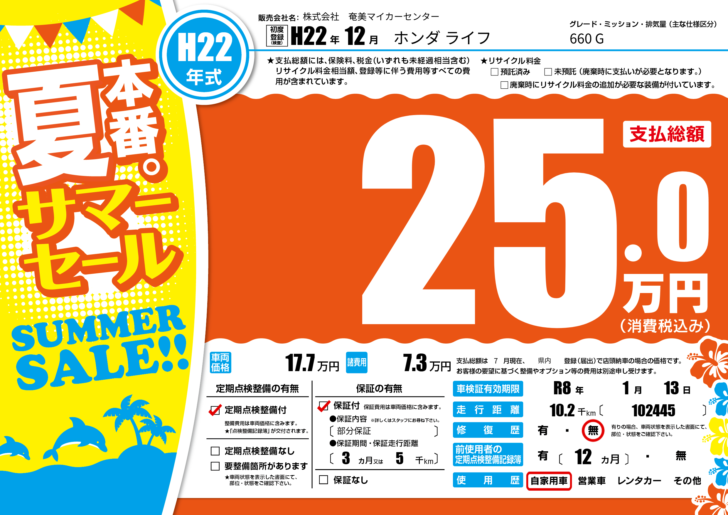 | 走行キロ | 1万km | 初年度登録 | H22年12月 |
