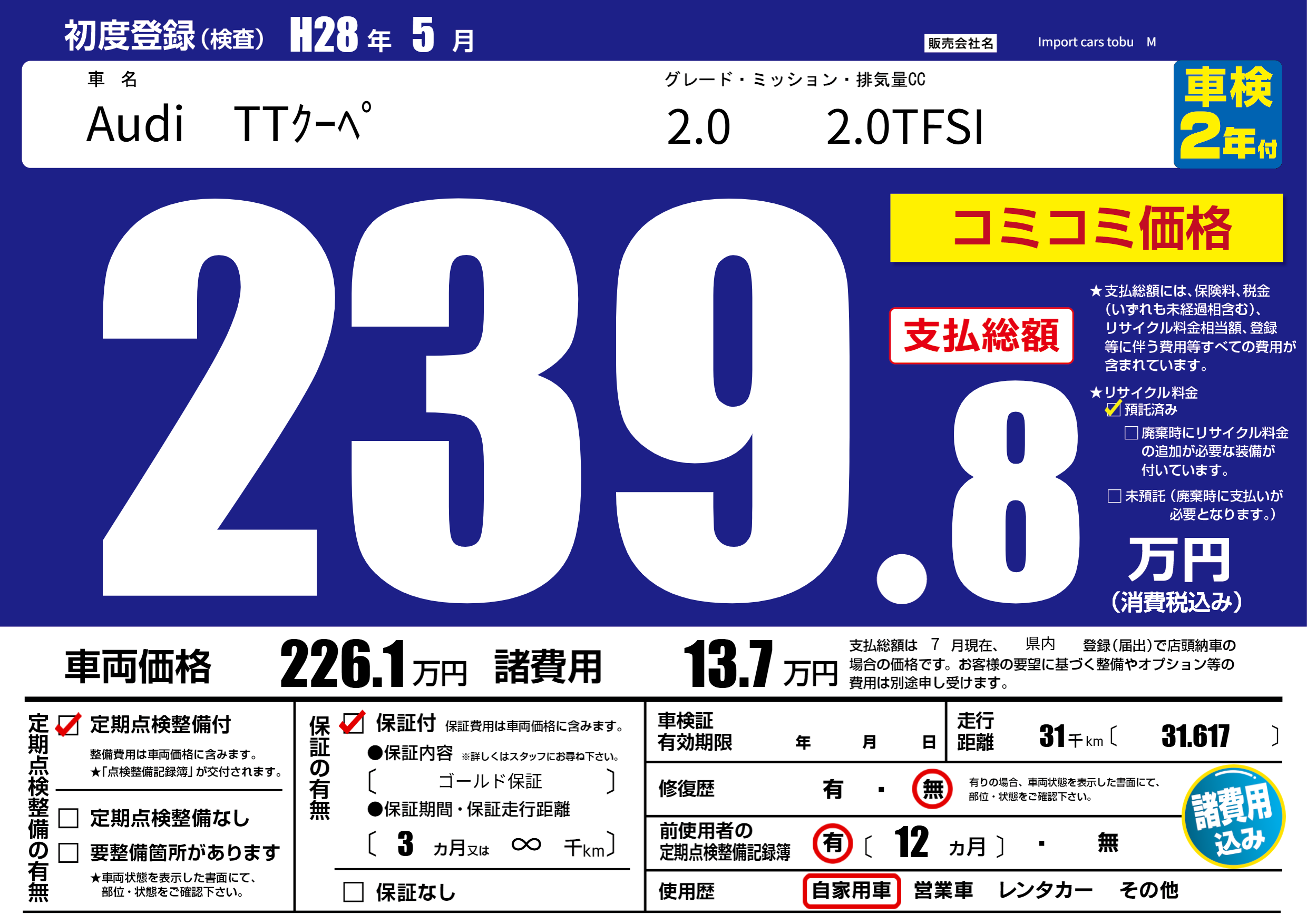 | 走行キロ | 3.1万km | 初年度登録 | H28年5月 |