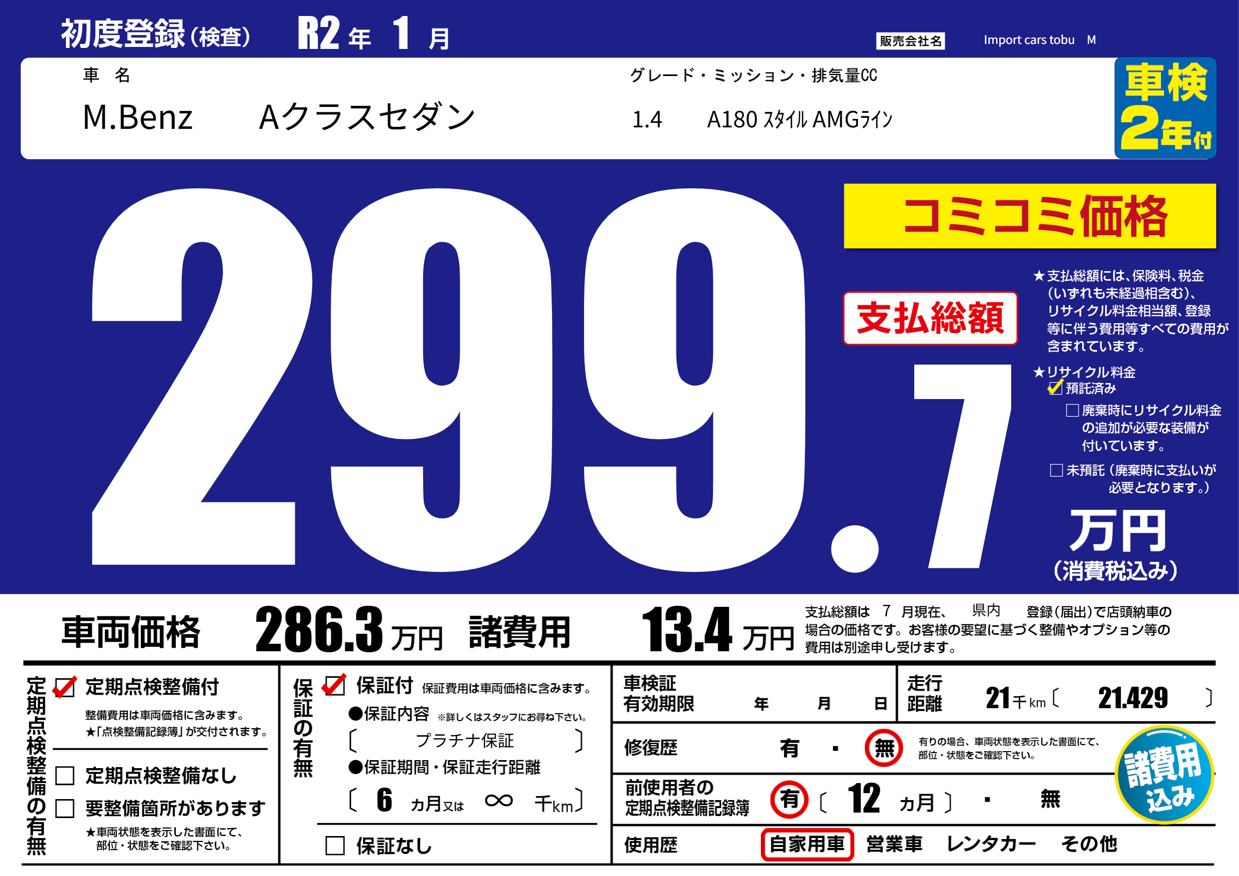 | 車名 | M.Benz Aクラスセダン | グレード ミッション 排気量 |