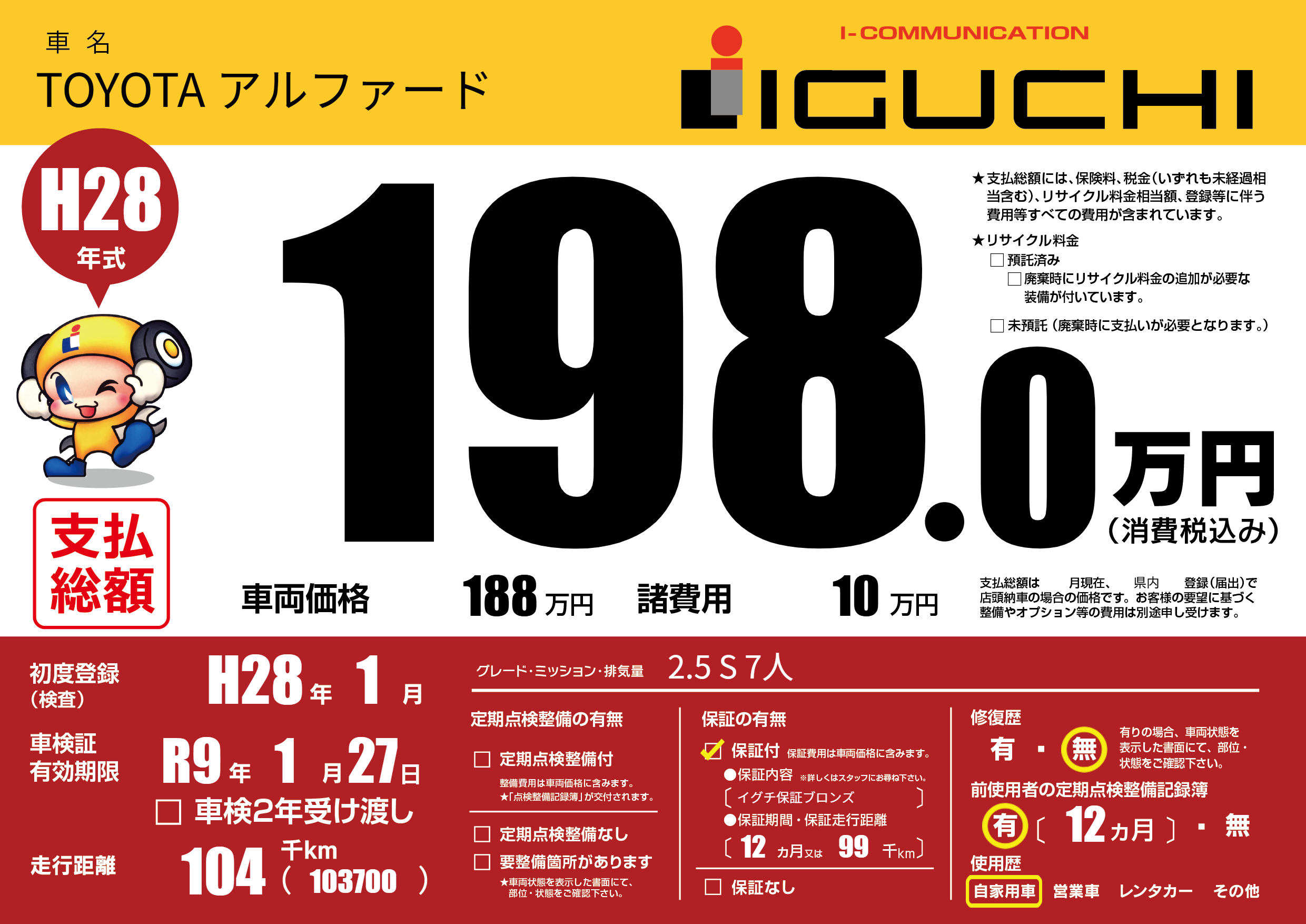 保証付き 保証内容(イグチ保証ブロンズ) 12ヶ月または(99)千kmまで |