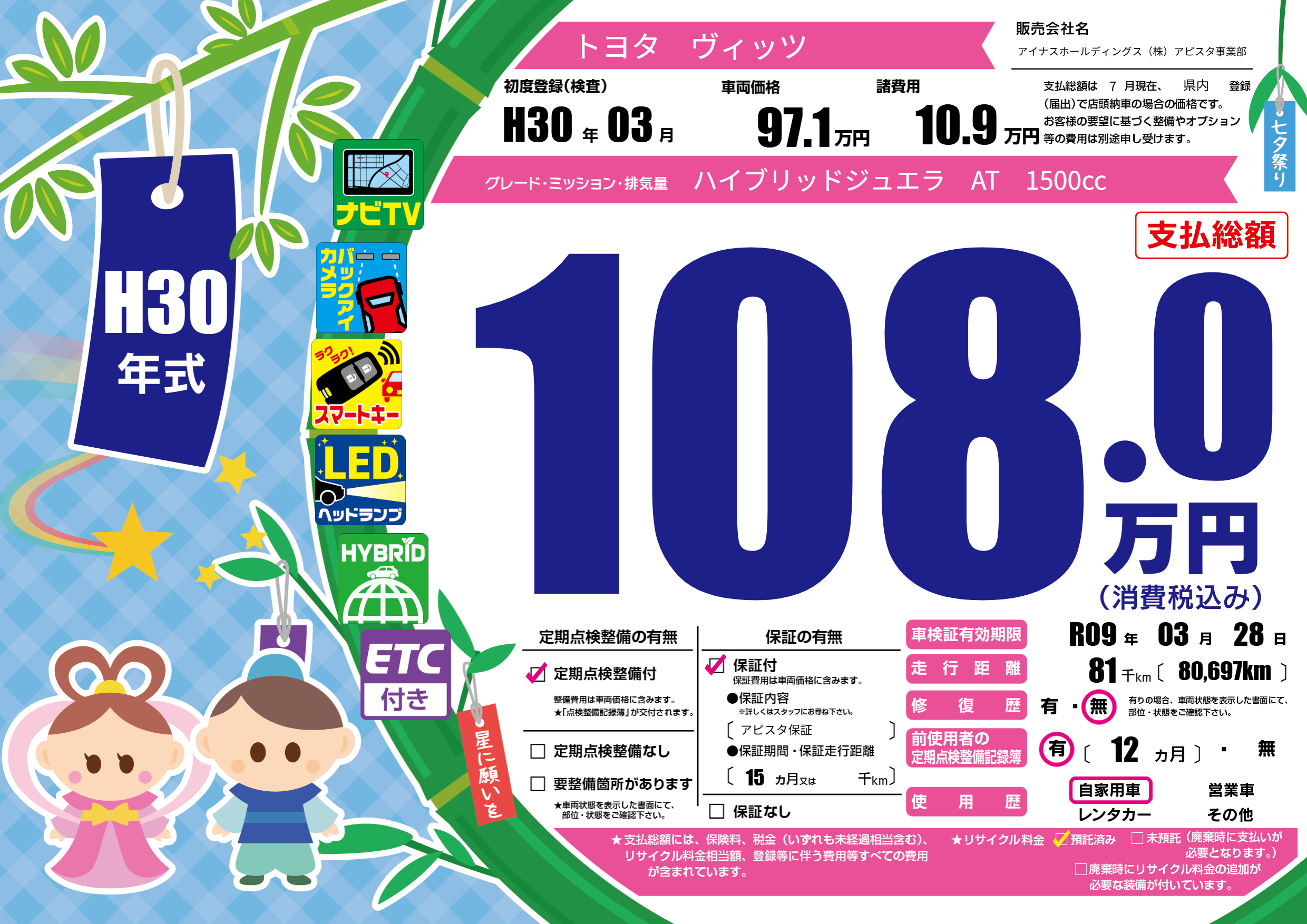 | 走行キロ | 8.1万km | 初年度登録 | H30年03月 |