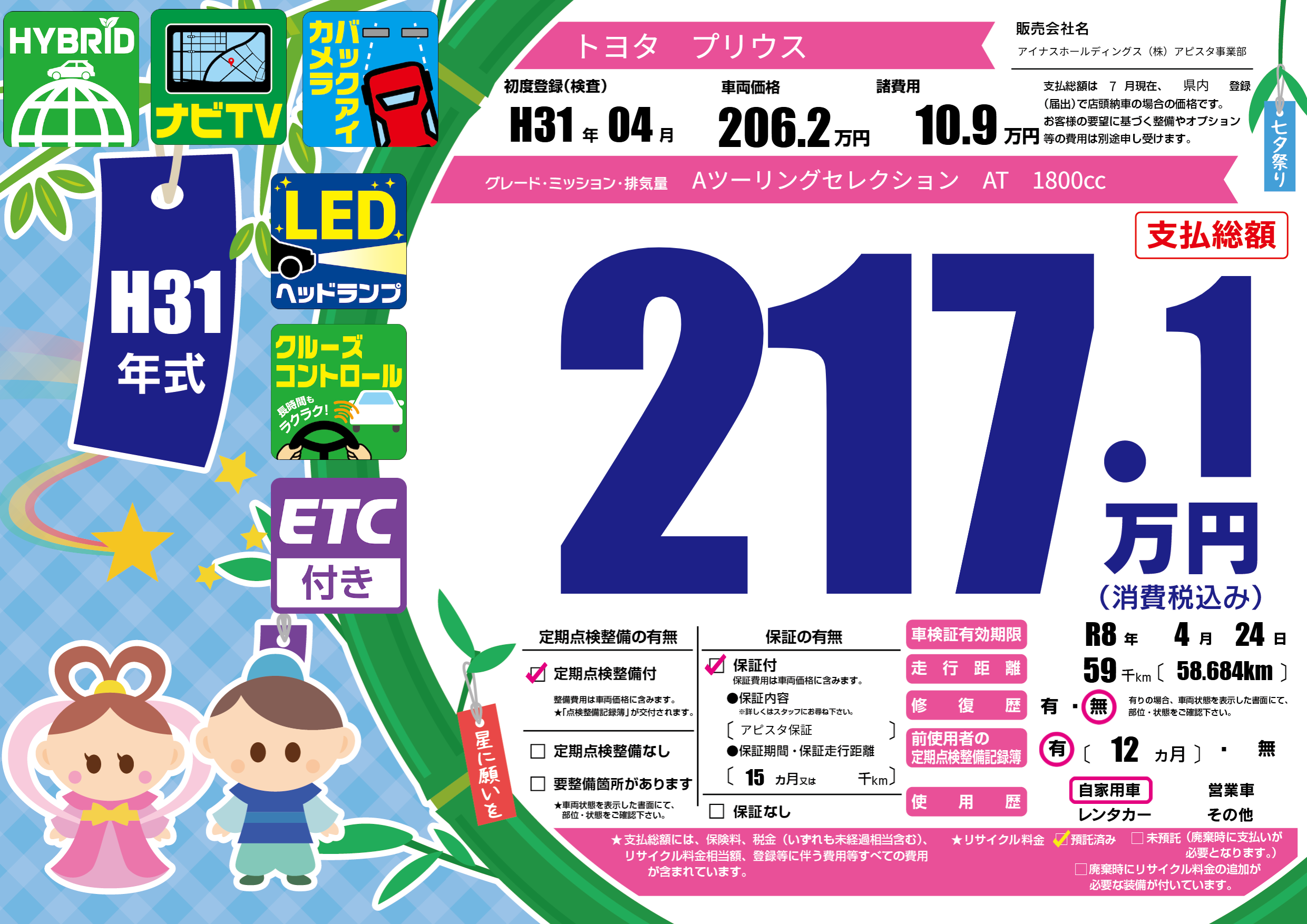 | 車名 | トヨタ プリウス | グレード ミッション 排気量 |