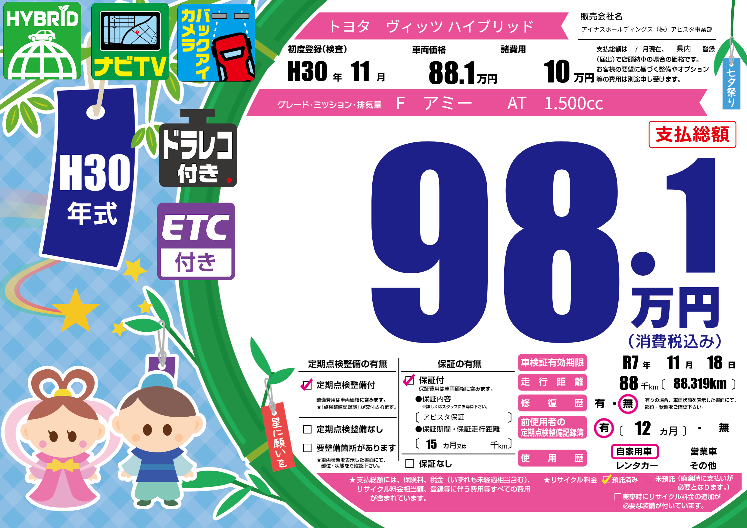 | 車名 | トヨタ ヴィッツ ハイブリッド | グレード ミッション 排気量 |