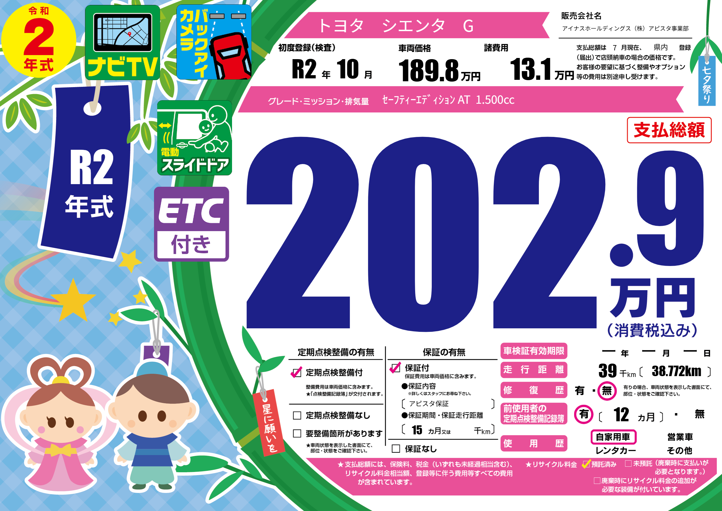 | 車名 | トヨタ シエンタ G | グレード ミッション 排気量 |