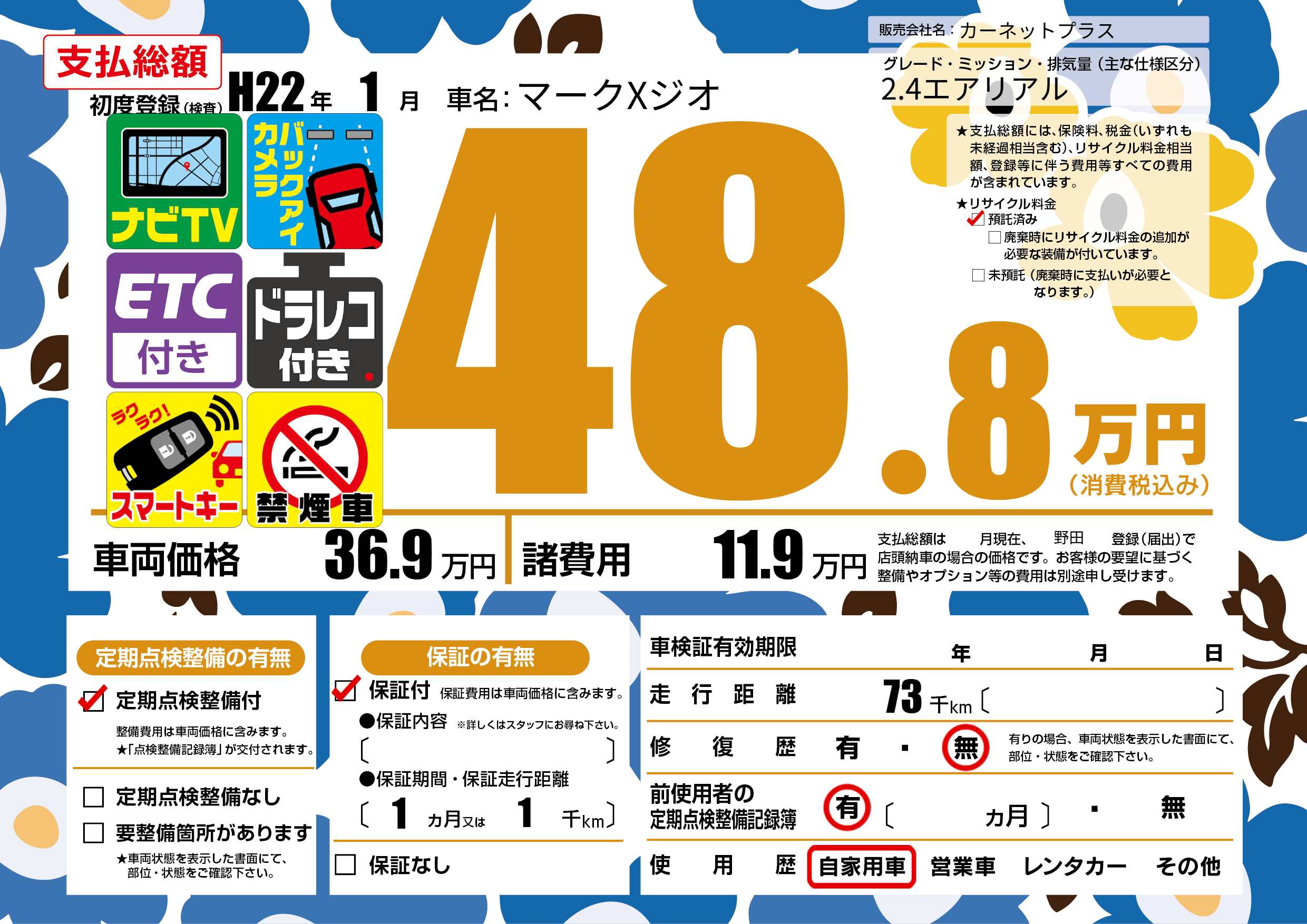 | 走行キロ | 7.3万km | 初年度登録 | H22年1月 |