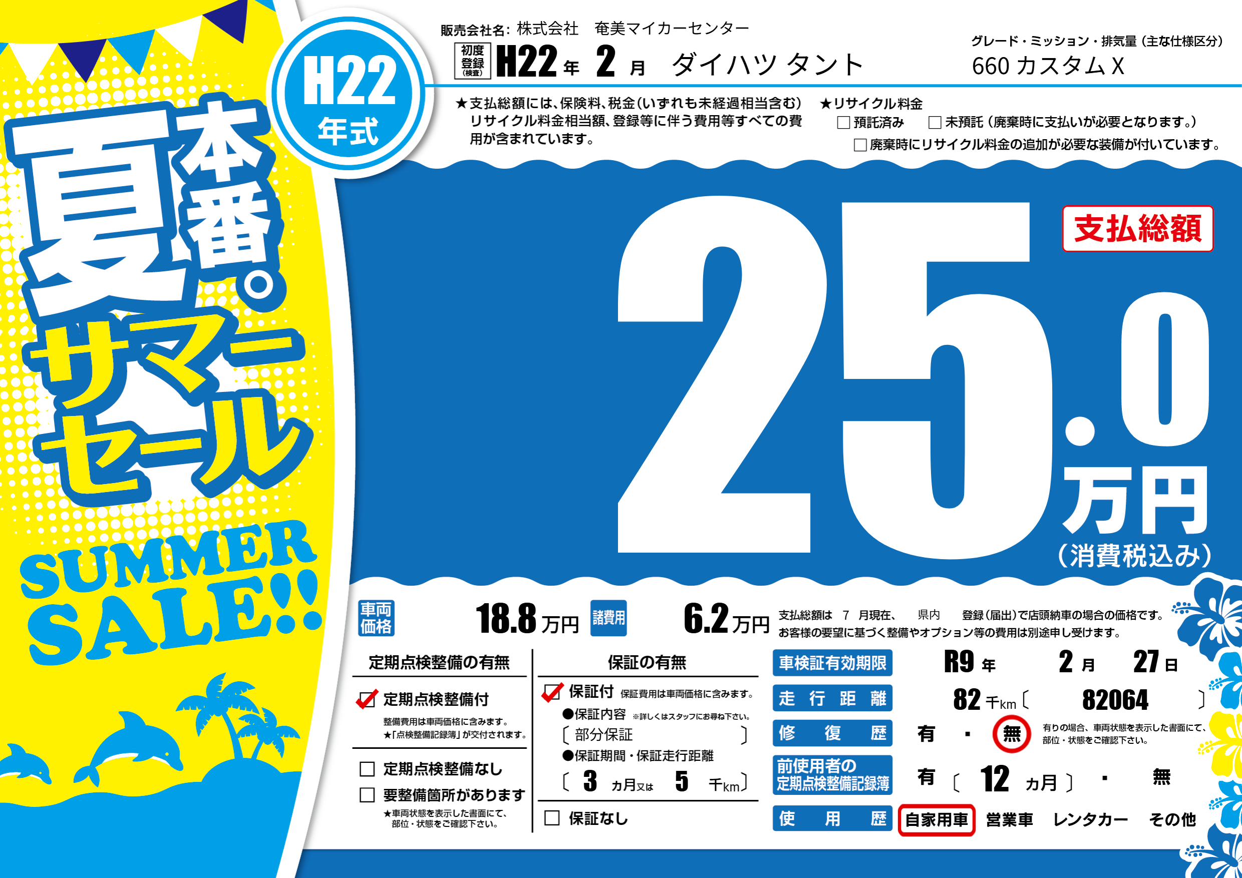 | 走行キロ | 8.2万km | 初年度登録 | H22年2月 |