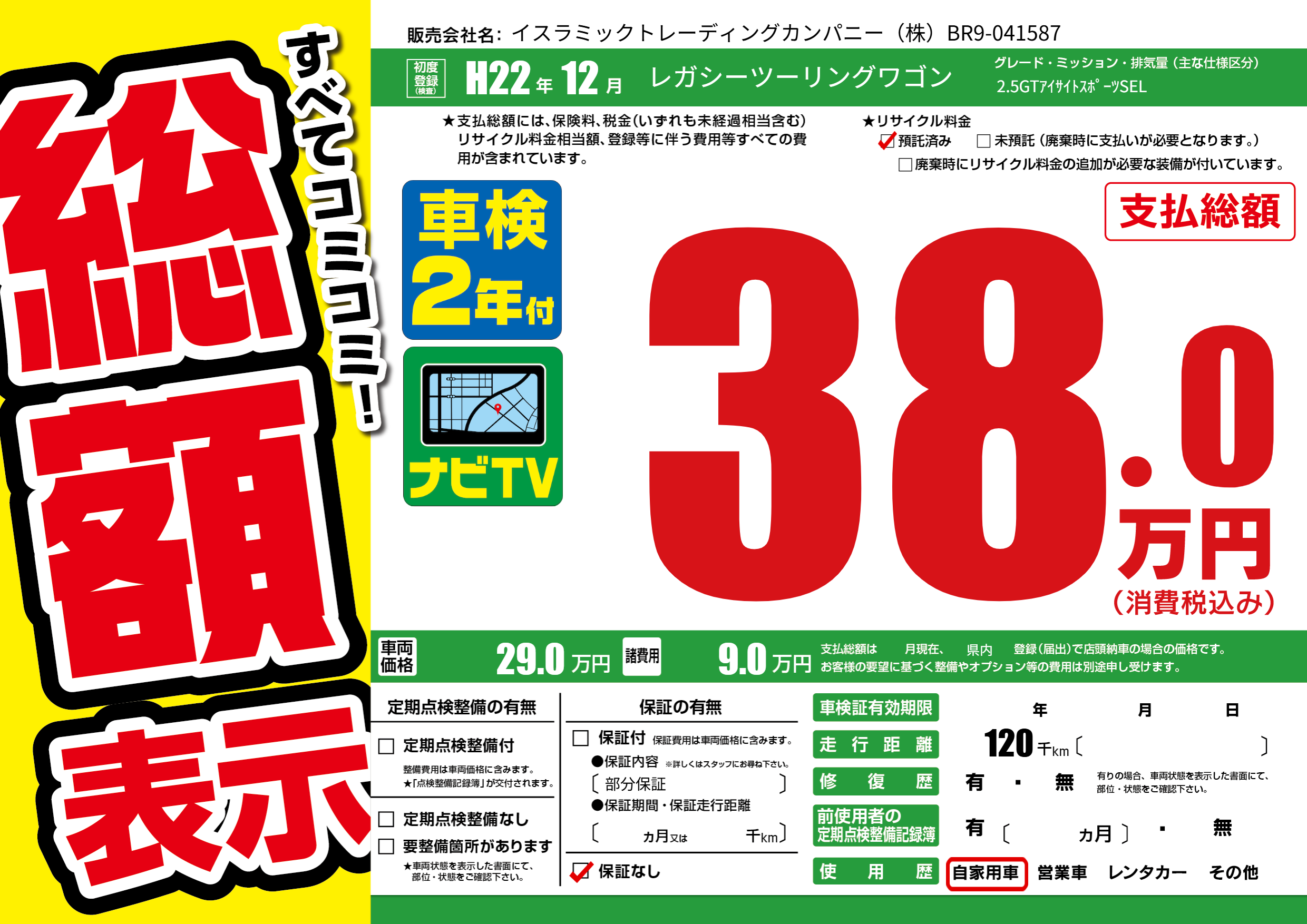 | 車名 | レガシーツーリングワゴン | グレード ミッション 排気量 |