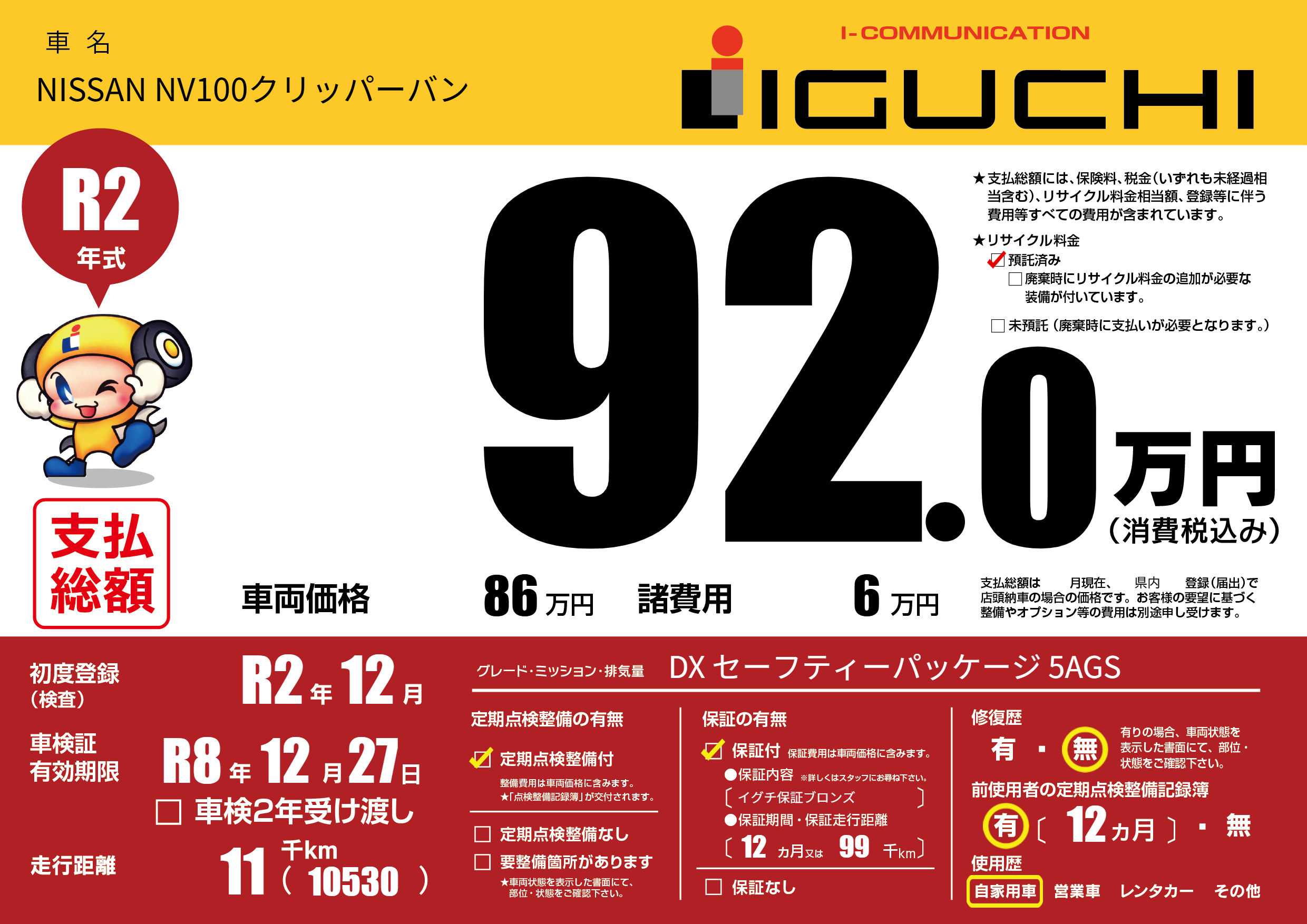 保証付き 保証内容(イグチ保証ブロンズ) 12ヶ月または(99)千kmまで |
