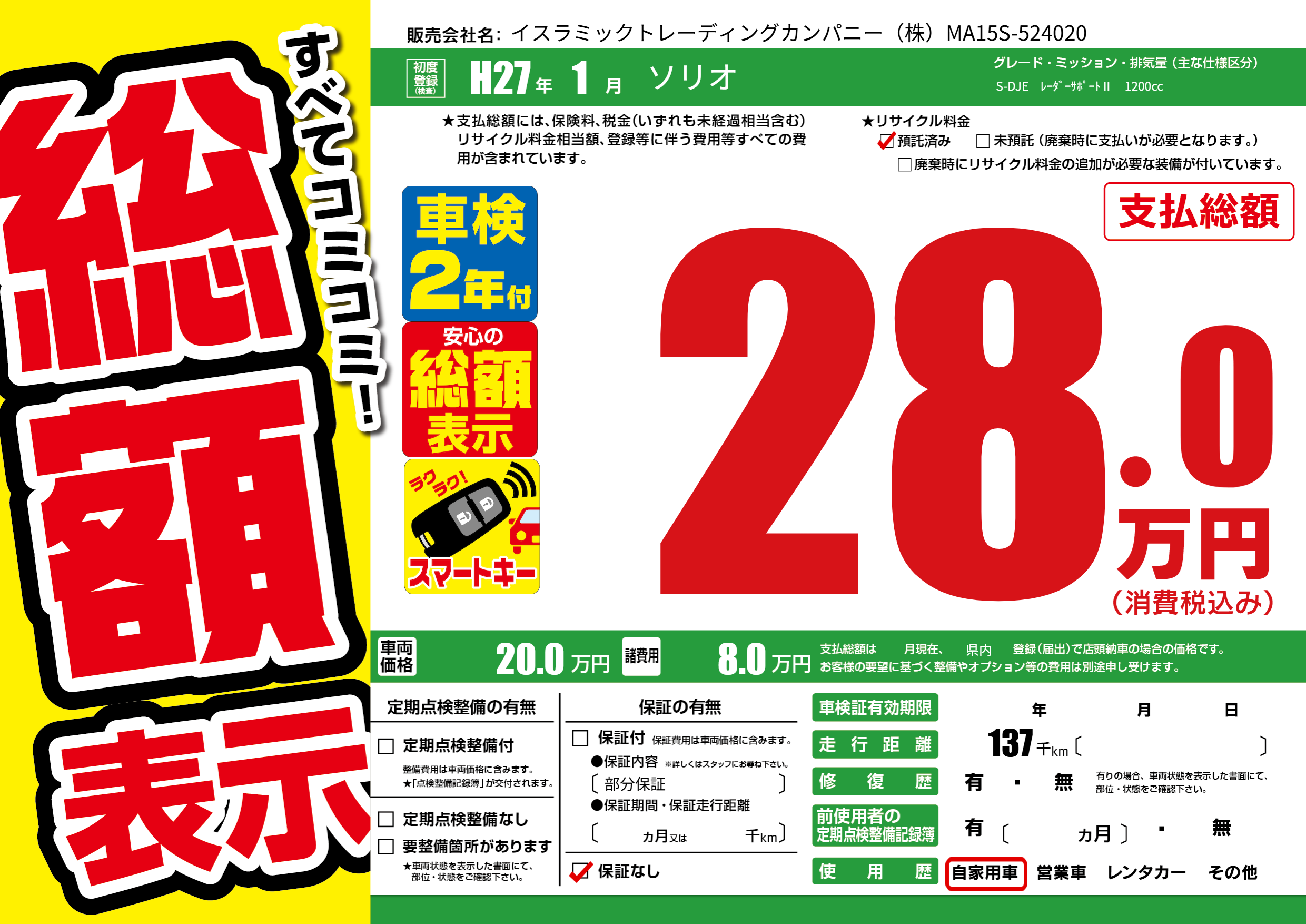 | 車名 | ソリオ | グレード ミッション 排気量 |