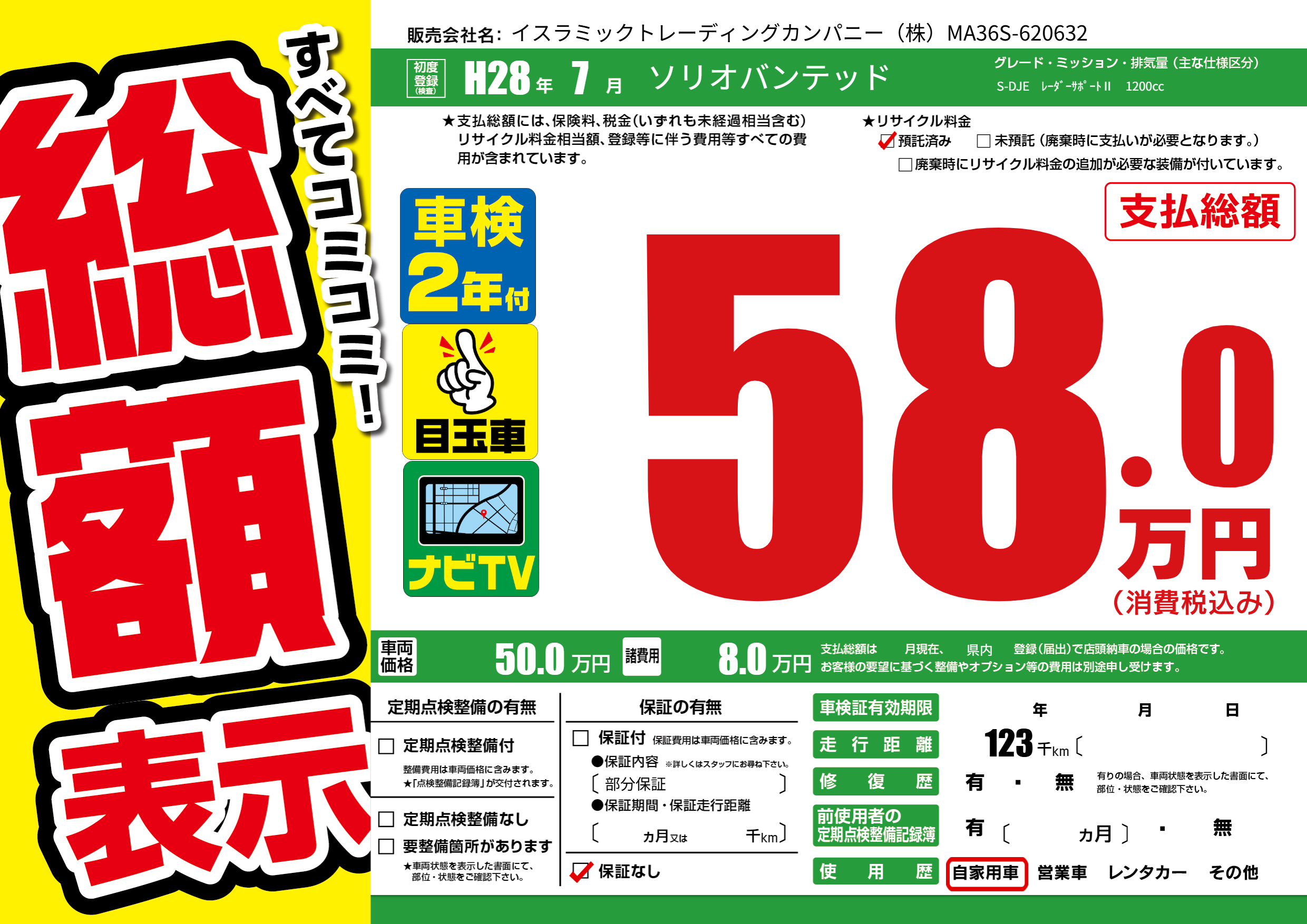 | 車名 | ソリオバンテッド | グレード ミッション 排気量 |