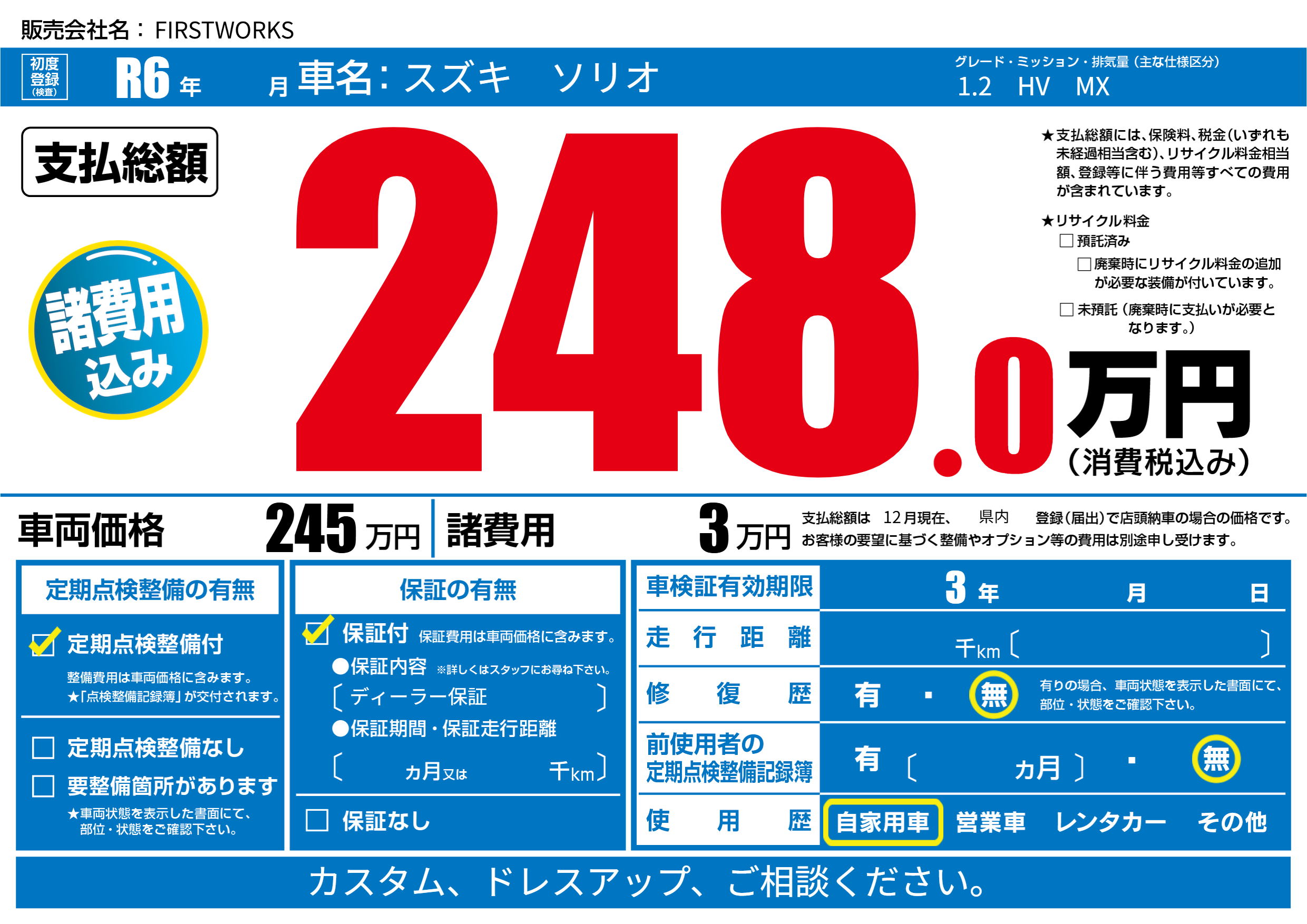 | 車名 | スズキ ソリオ | グレード ミッション 排気量 |