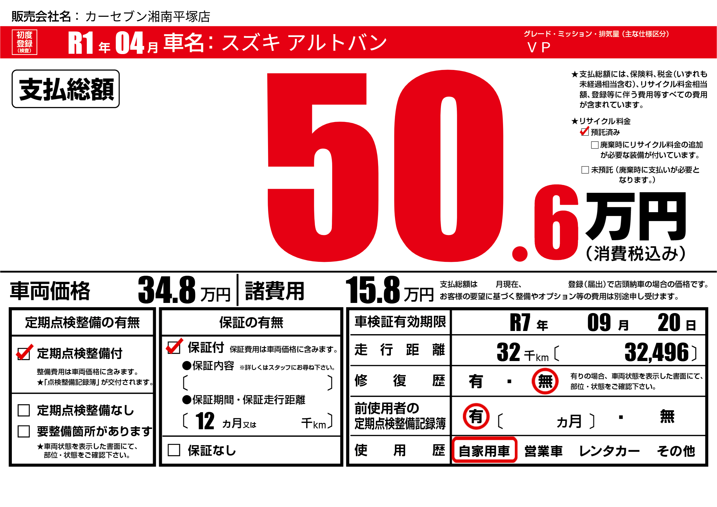なし | 車検制限 | R7年09月20月 |