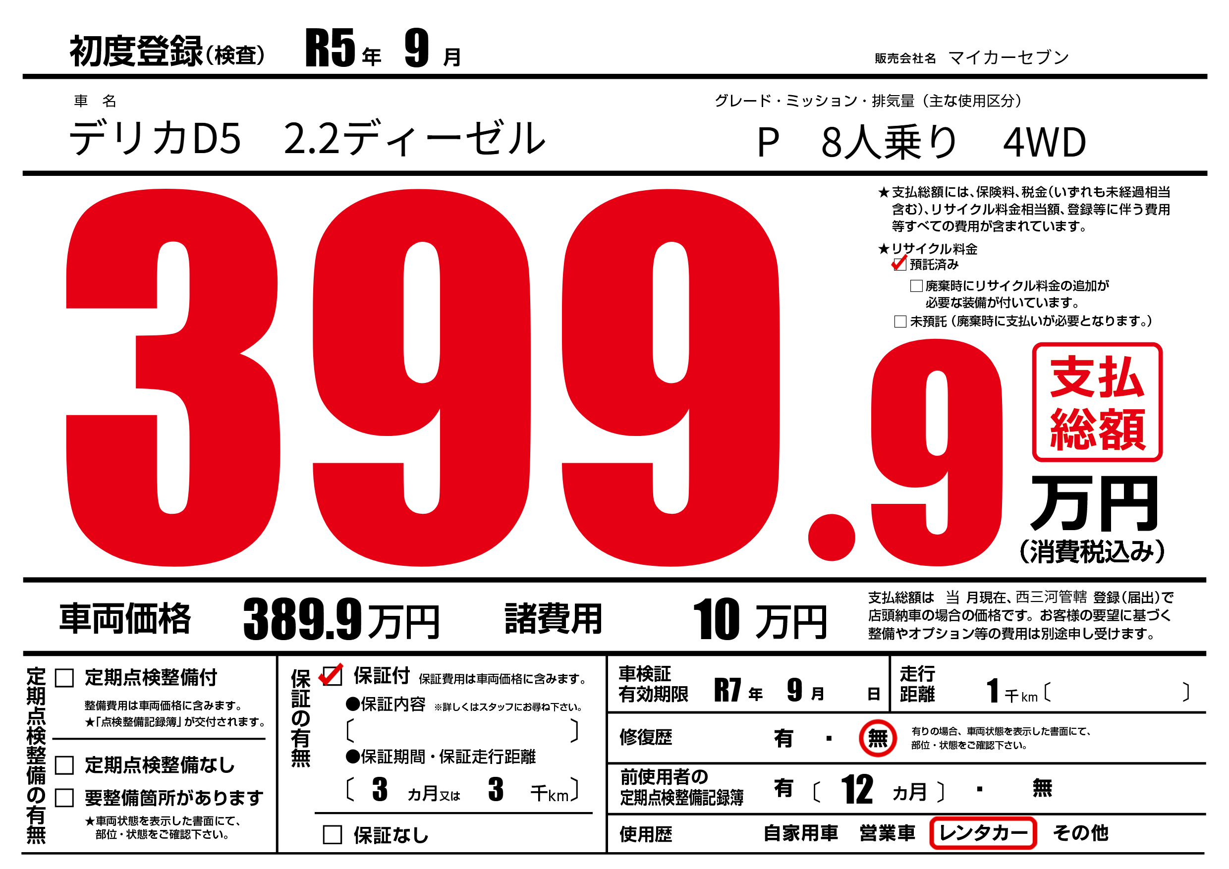 | 車名 | デリカD5 2.2ディーゼル | グレード ミッション 排気量 |