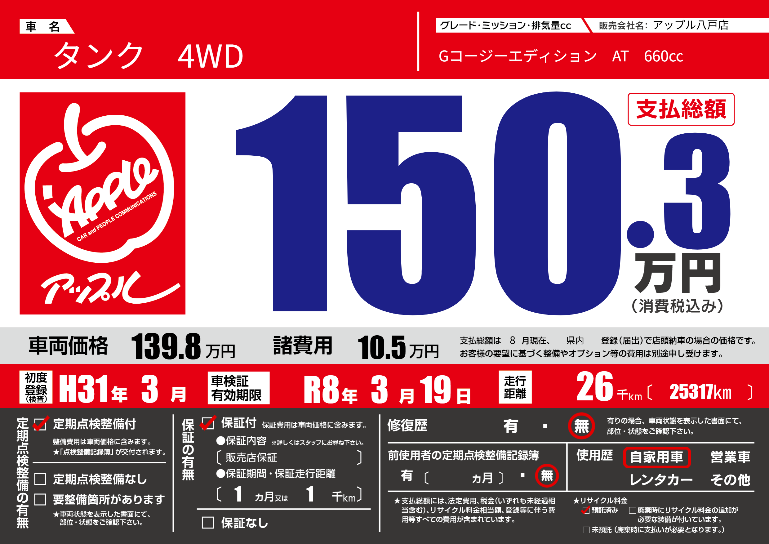 | 車名 | タンク 4WD | グレード ミッション 排気量 |