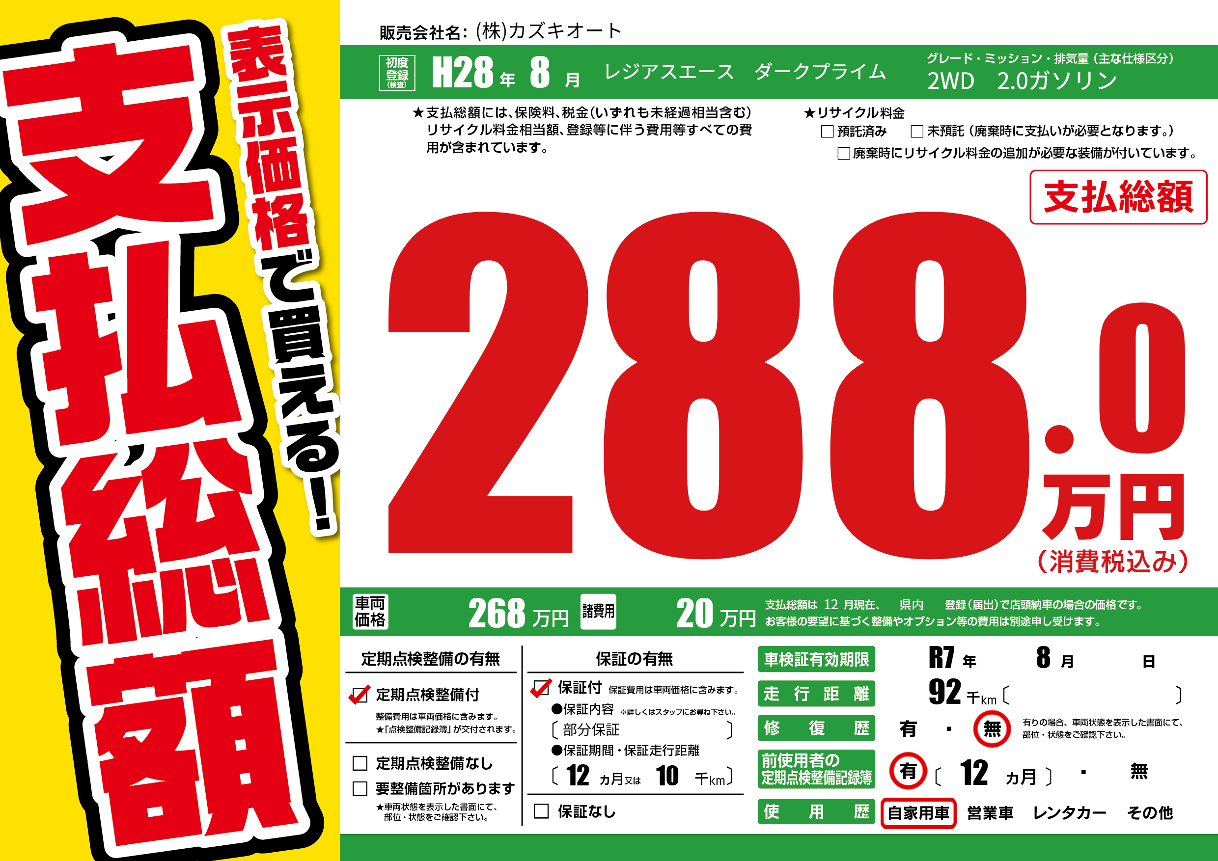 | 走行キロ | 9.2万km | 初年度登録 | H28年8月 |