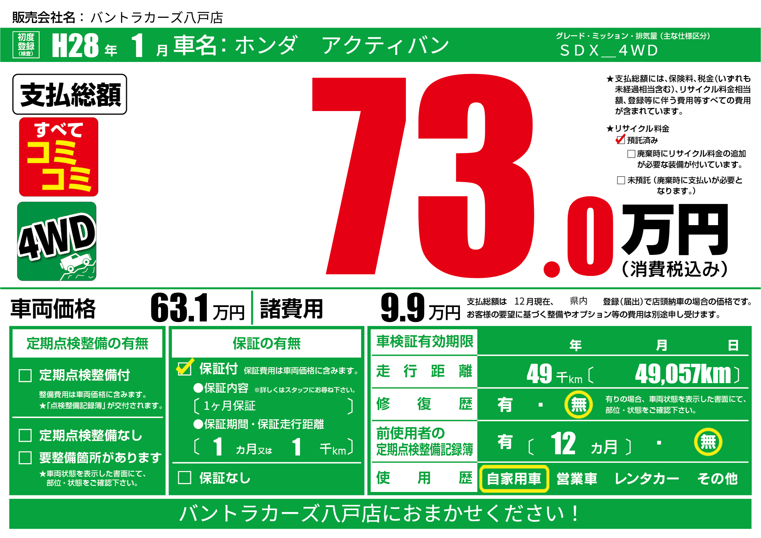 | 車名 | ホンダ アクティバン | グレード ミッション 排気量 |