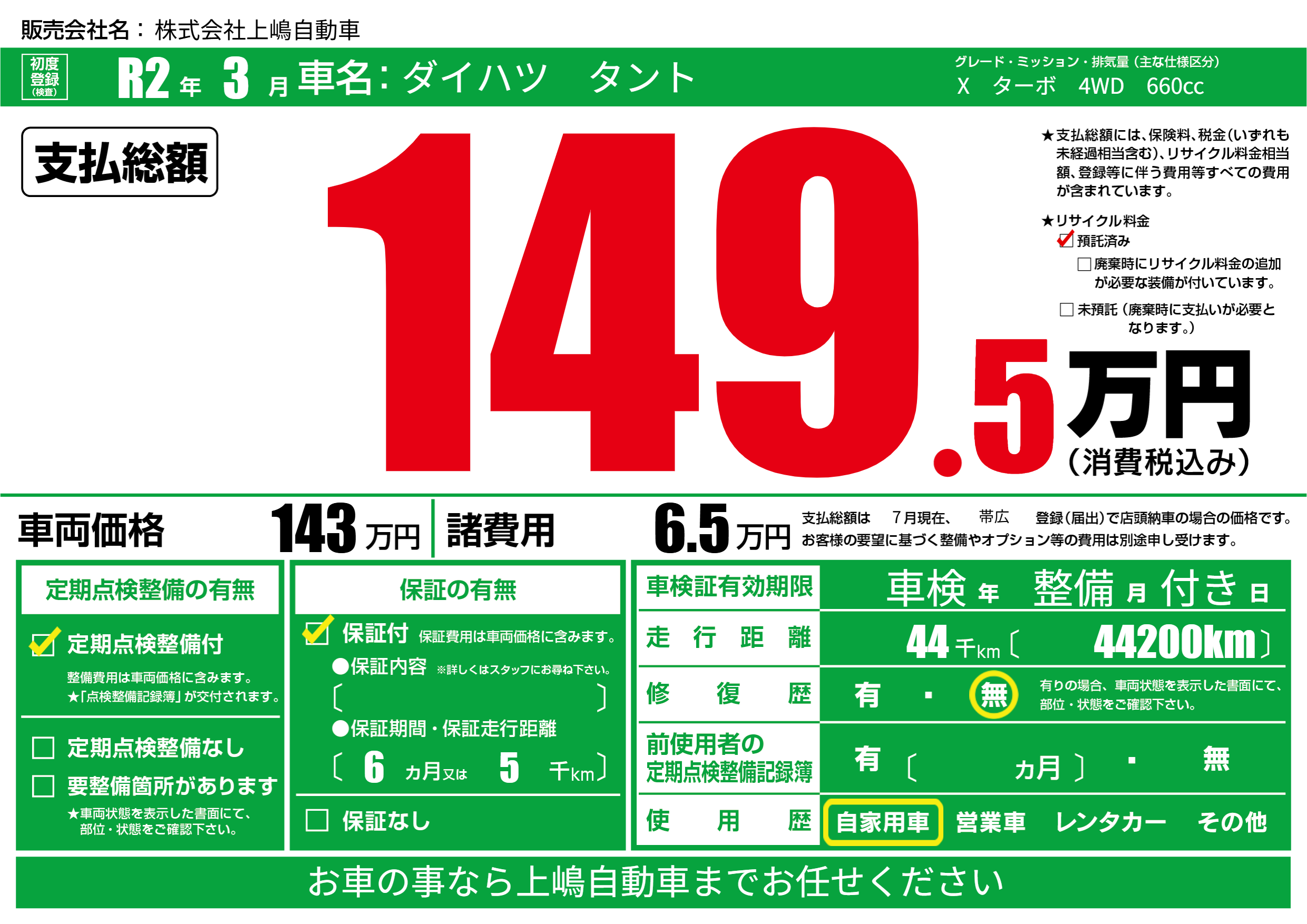 | 車名 | ダイハツ タント | グレード ミッション 排気量 |