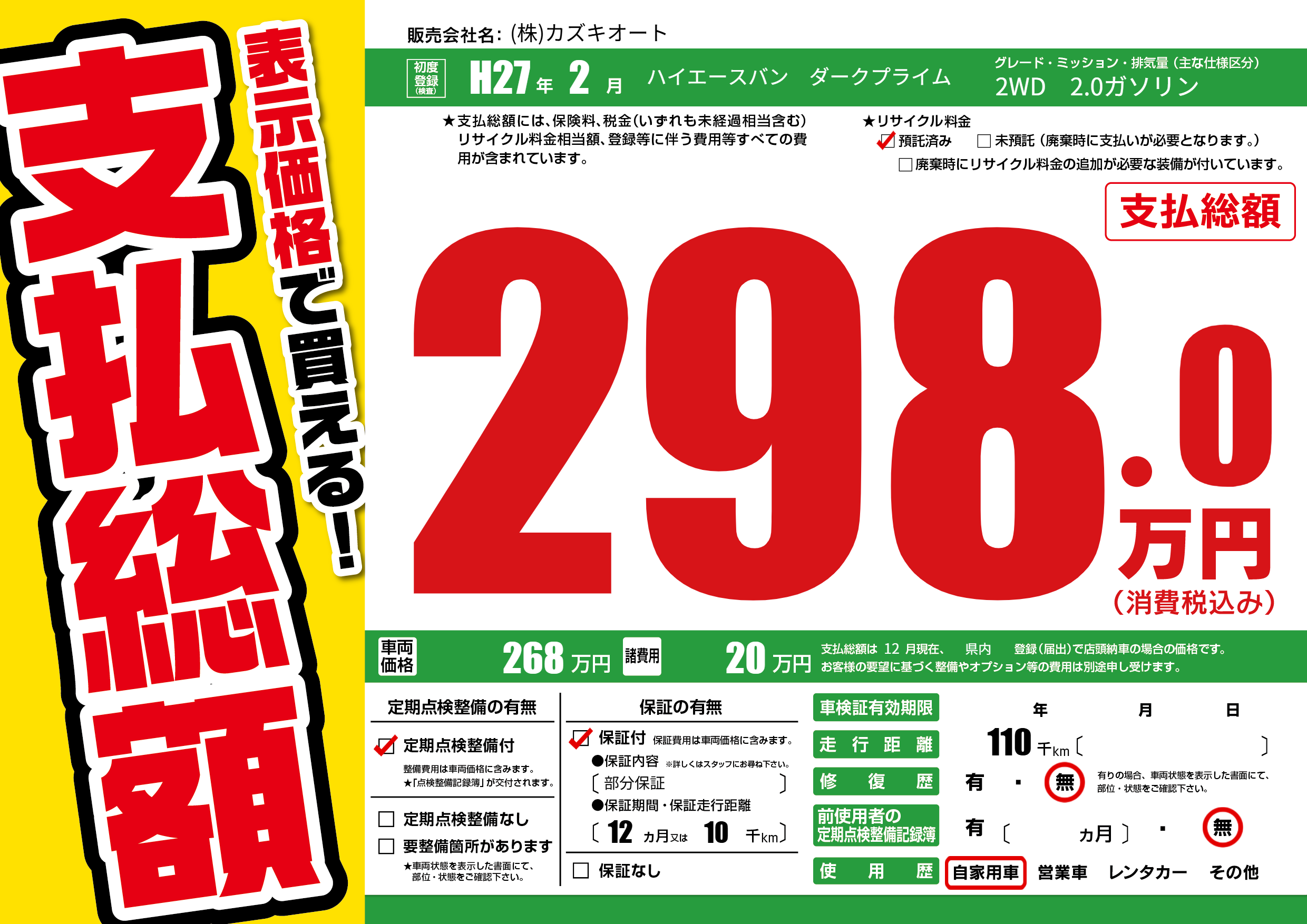 | 走行キロ | 11万km | 初年度登録 | H27年2月 |