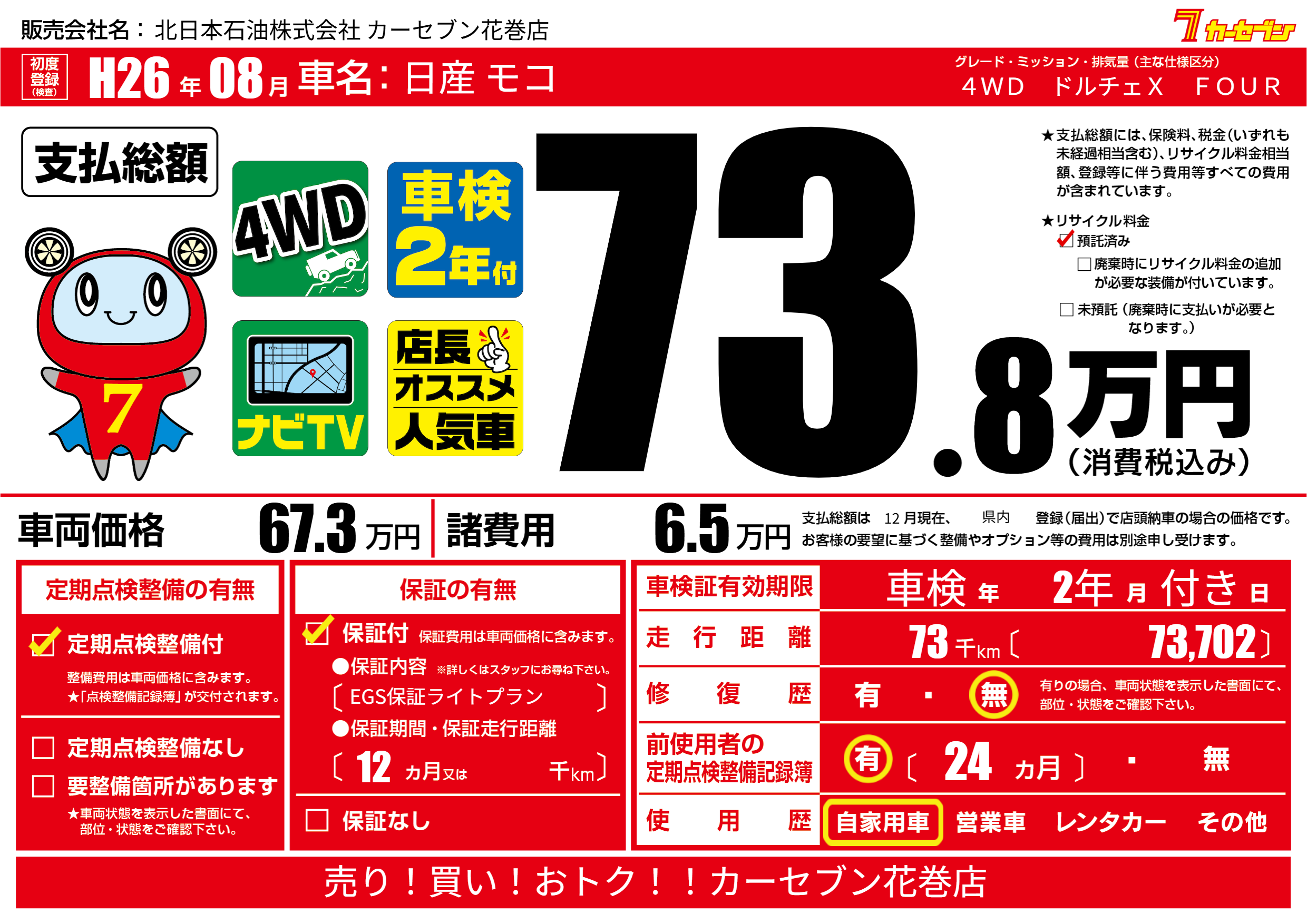 | 走行キロ | 7.3万km | 初年度登録 | H26年08月 |