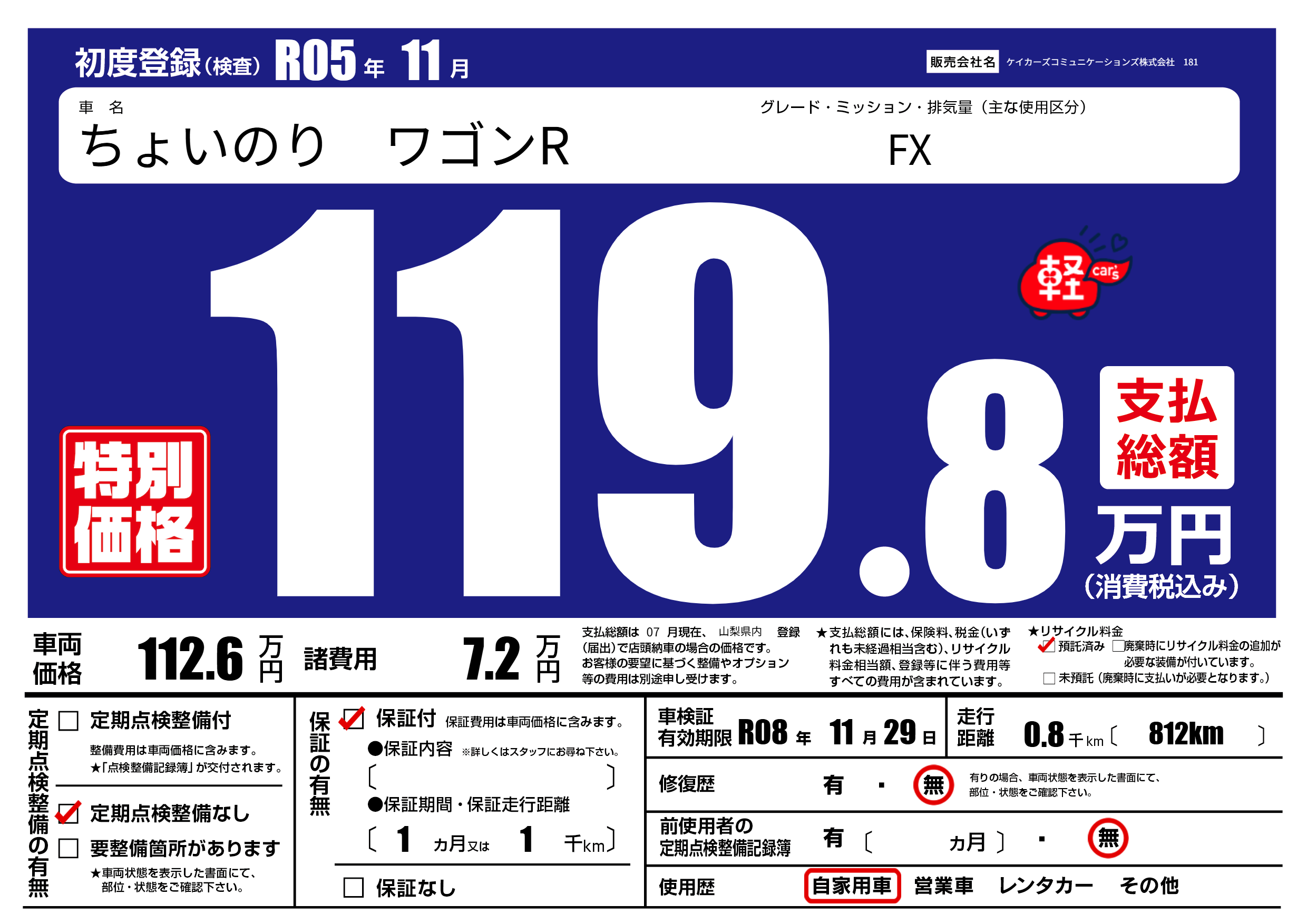 | 走行キロ | - | 初年度登録 | R05年11月 |