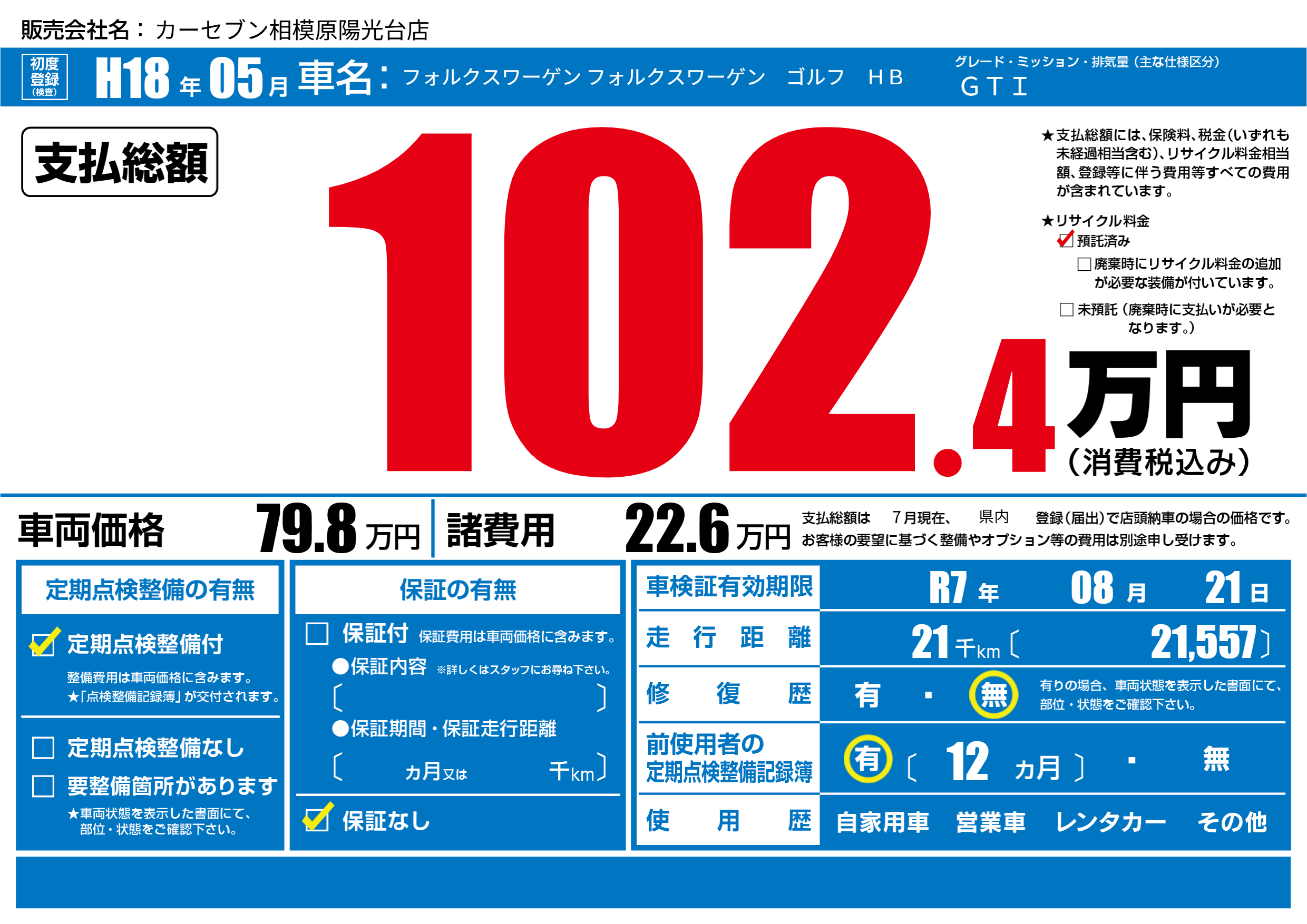 なし | 車検制限 | R7年08月21月 |