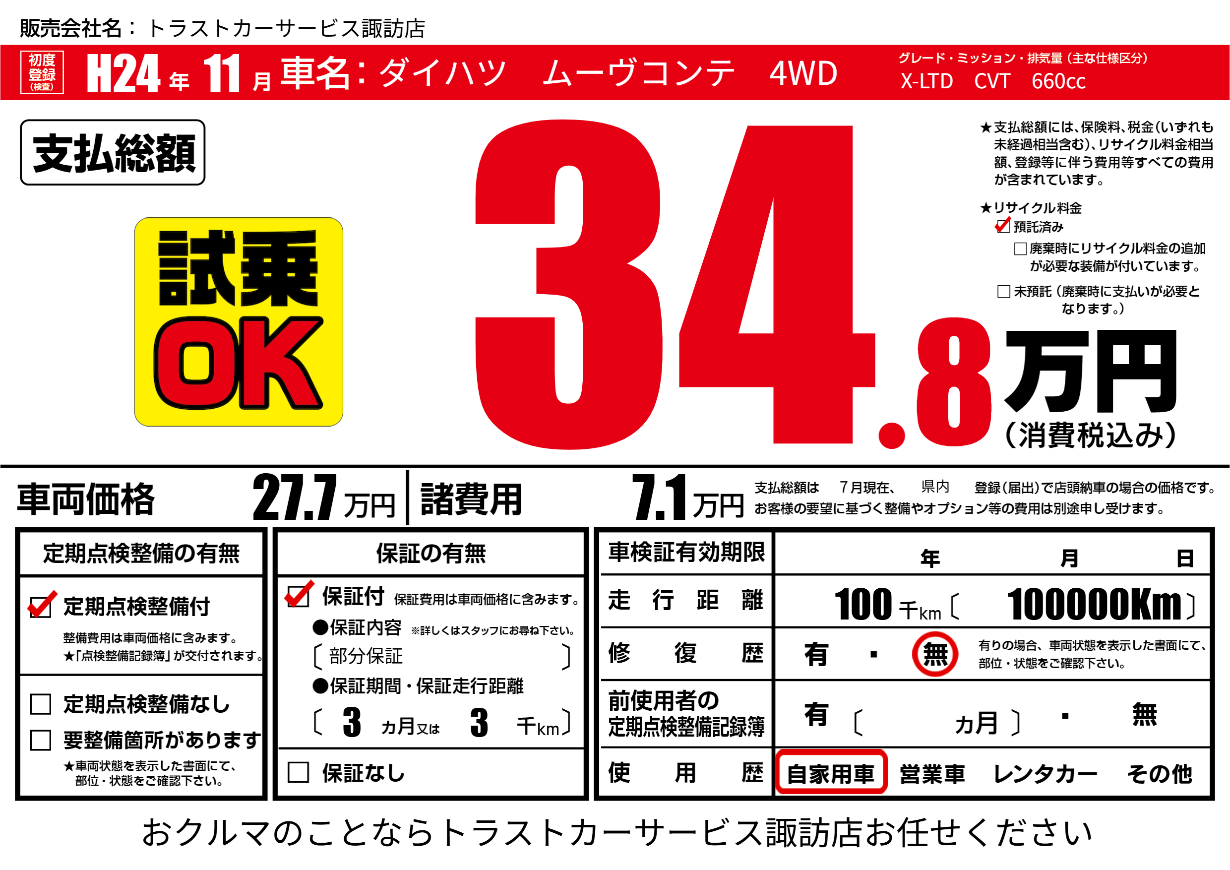 | 車名 | ダイハツ ムーヴコンテ 4WD | グレード ミッション 排気量 |