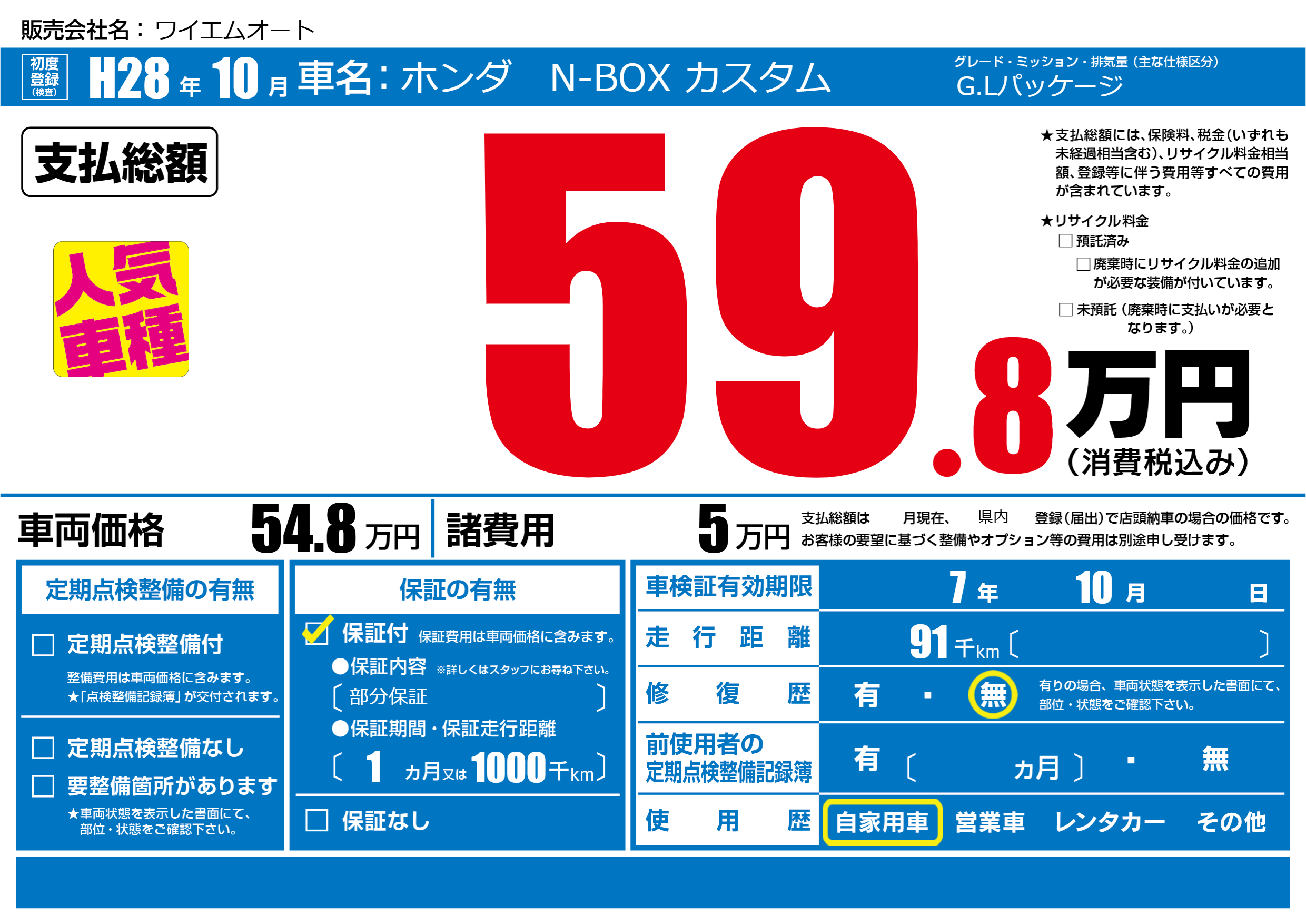 | 車名 | ホンダ N-BOX カスタム | グレード ミッション 排気量 |