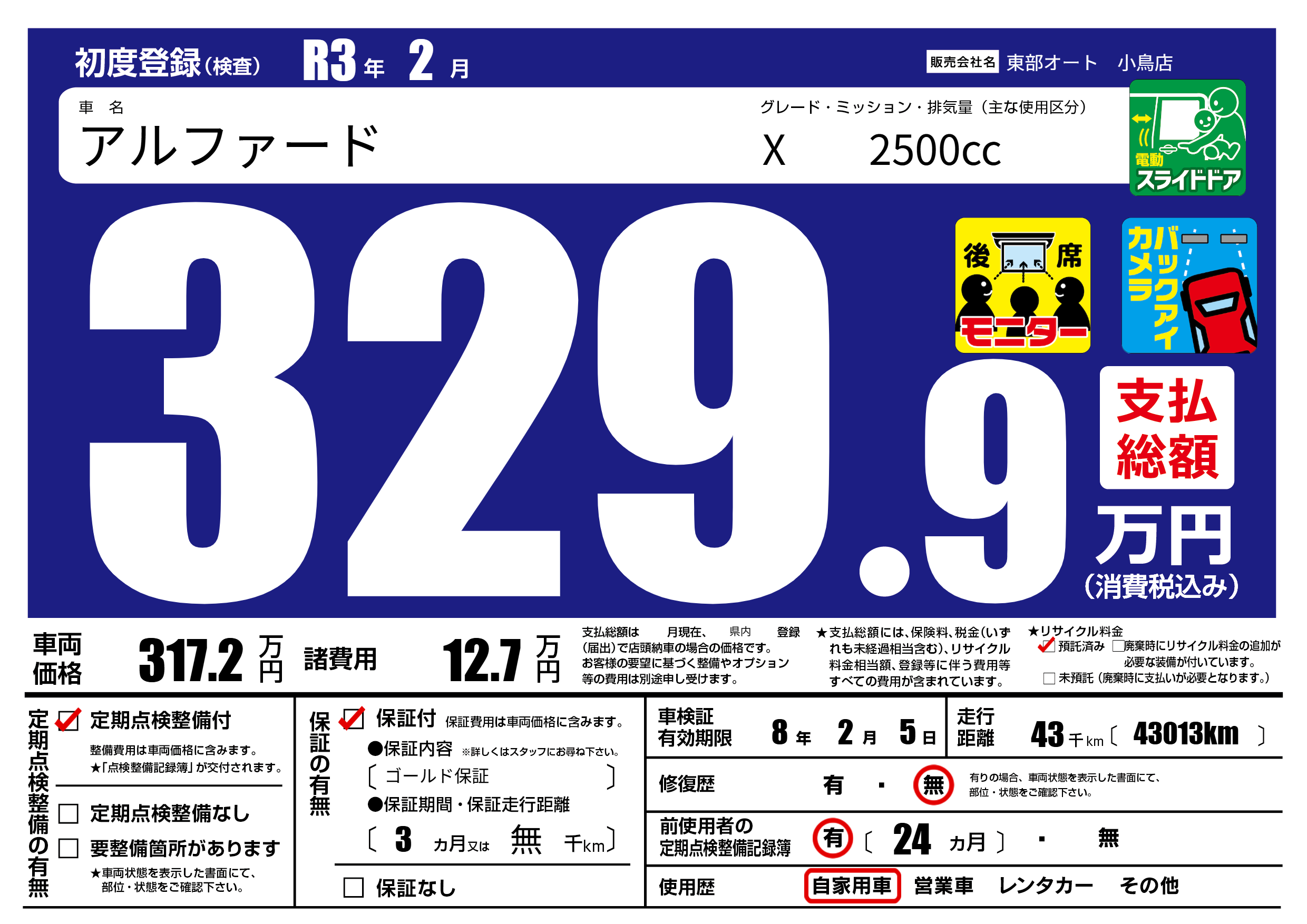 | 走行キロ | 4.3万km | 初年度登録 | R3年2月 |