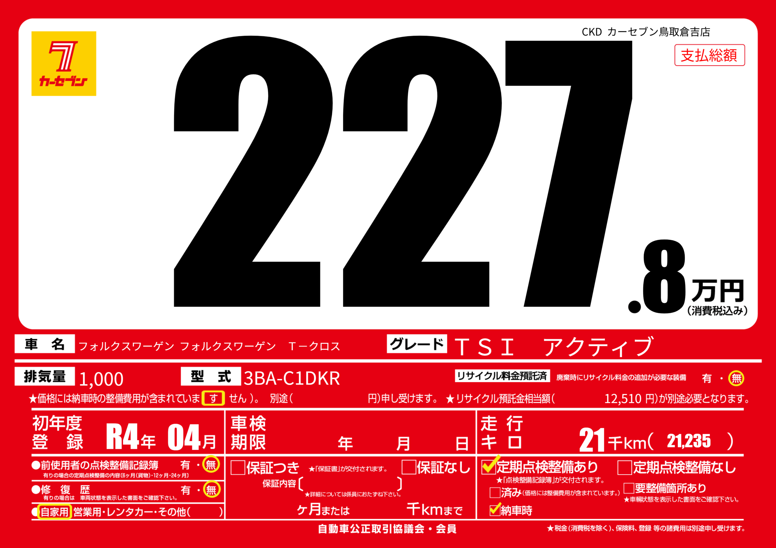 | 車名 | フォルクスワーゲン フォルクスワーゲン T-クロス | グレード ミッション 排気量 |