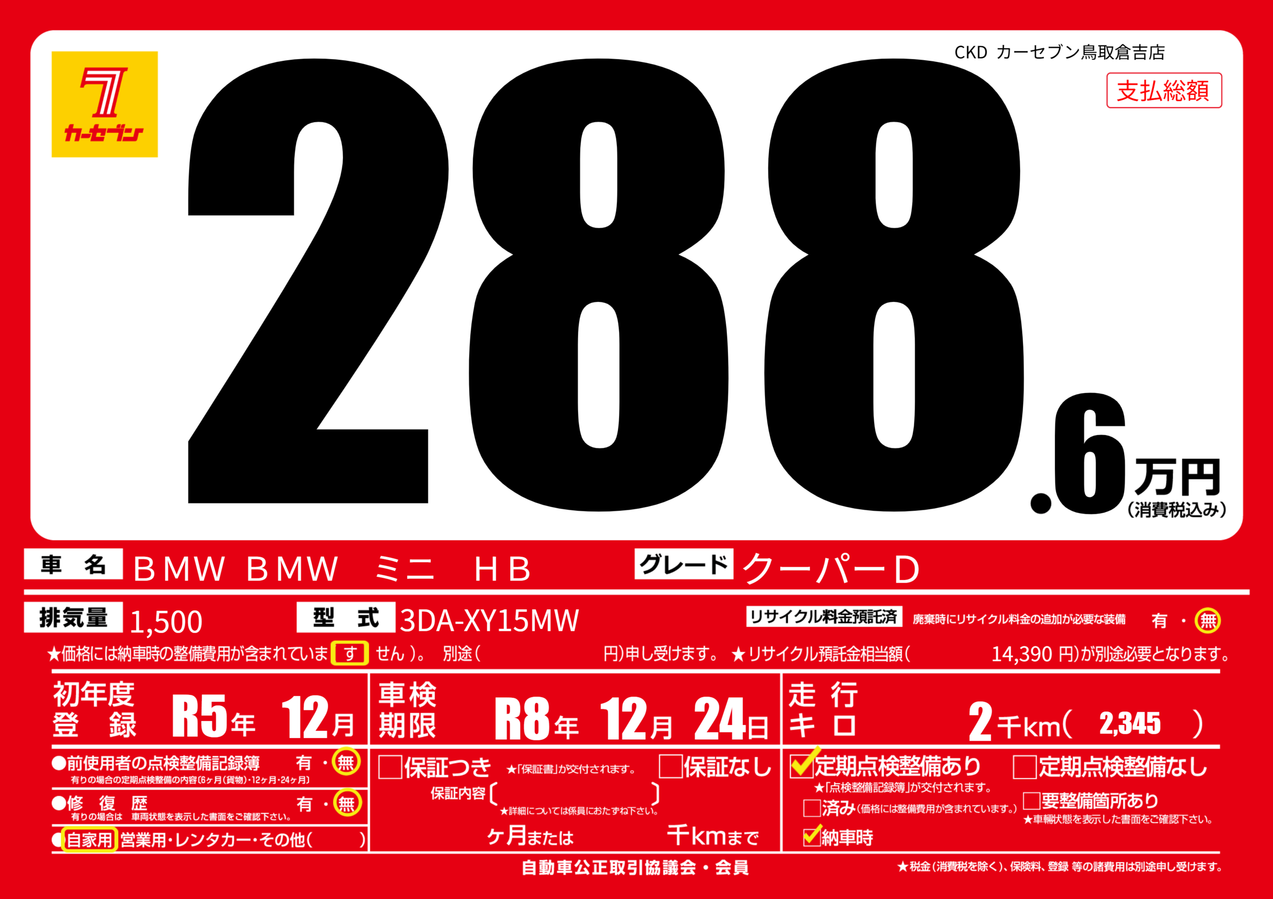 | 車名 | BMW BMW ミニ HB | グレード ミッション 排気量 |