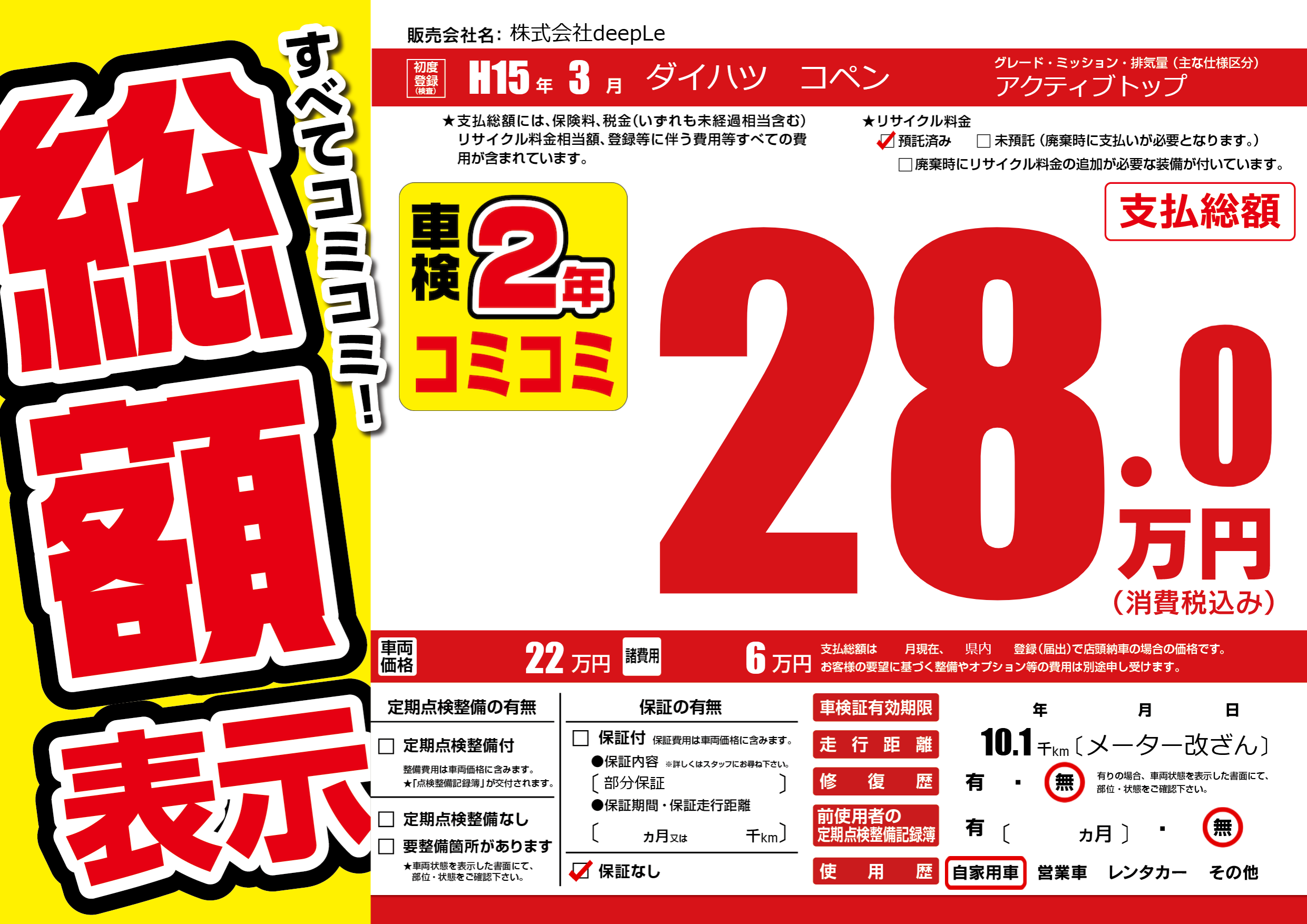保証なし 保証内容(部分保証) ---ヶ月または()千kmまで |