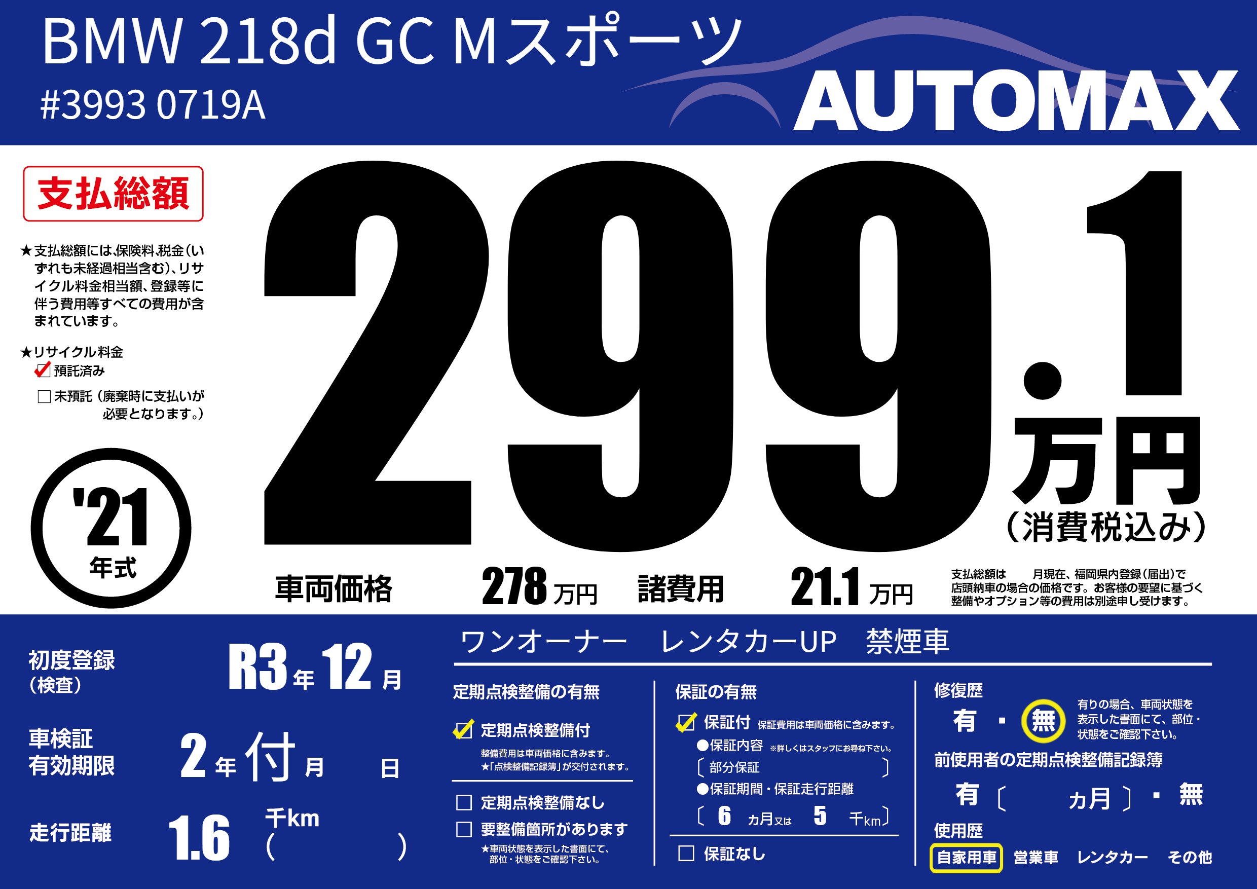 | 車名 | BMW 218d GC Mスポーツ | グレード ミッション 排気量 |