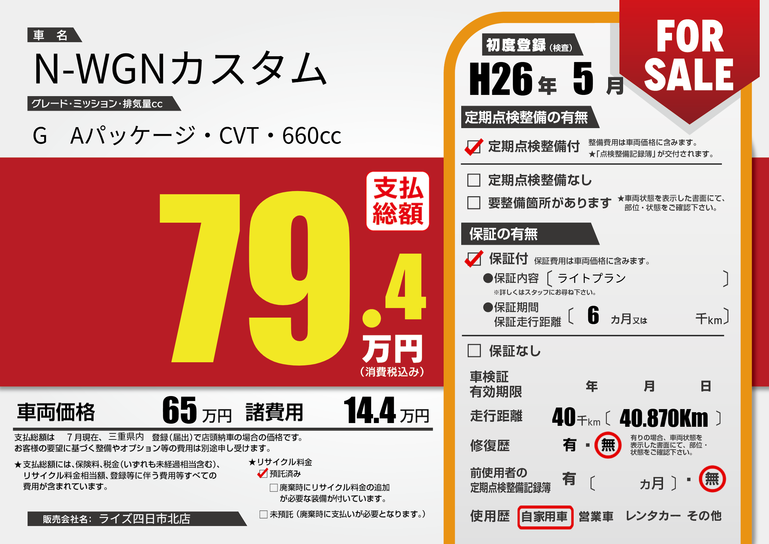 | 車名 | N-WGNカスタム | グレード ミッション 排気量 |