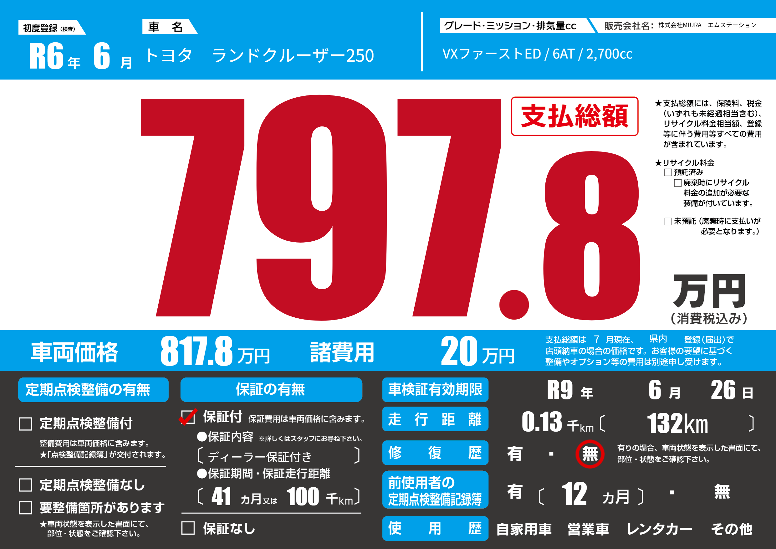 | 車名 | トヨタ ランドクルーザー250 | グレード ミッション 排気量 |