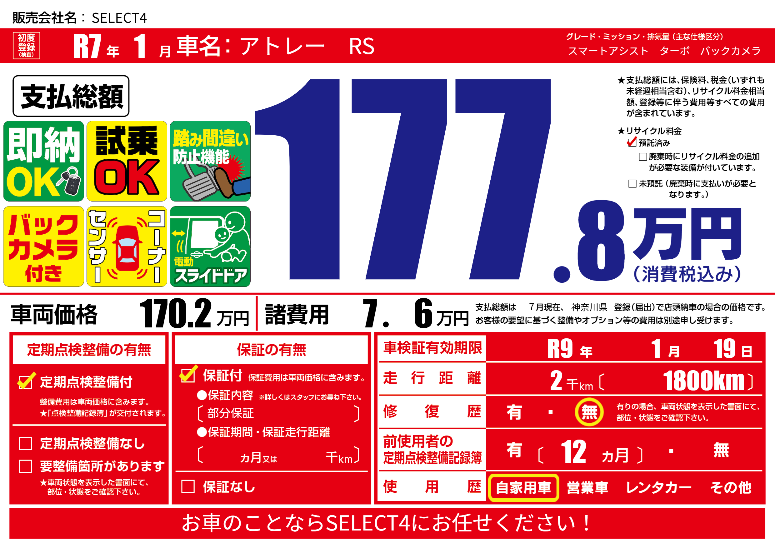| 走行キロ | 0.2万km | 初年度登録 | R7年1月 |