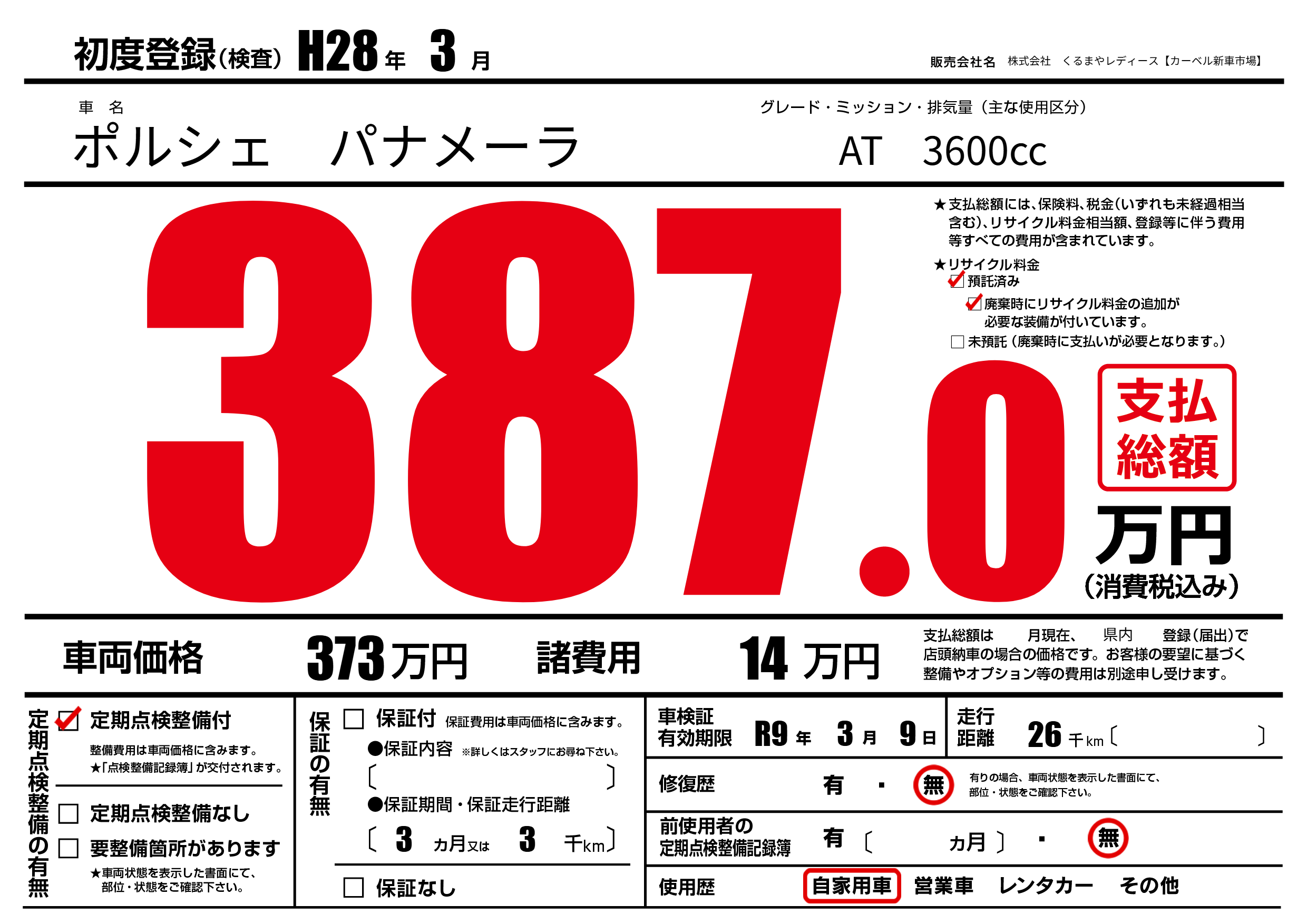 | 車名 | ポルシェ パナメーラ | グレード ミッション 排気量 |