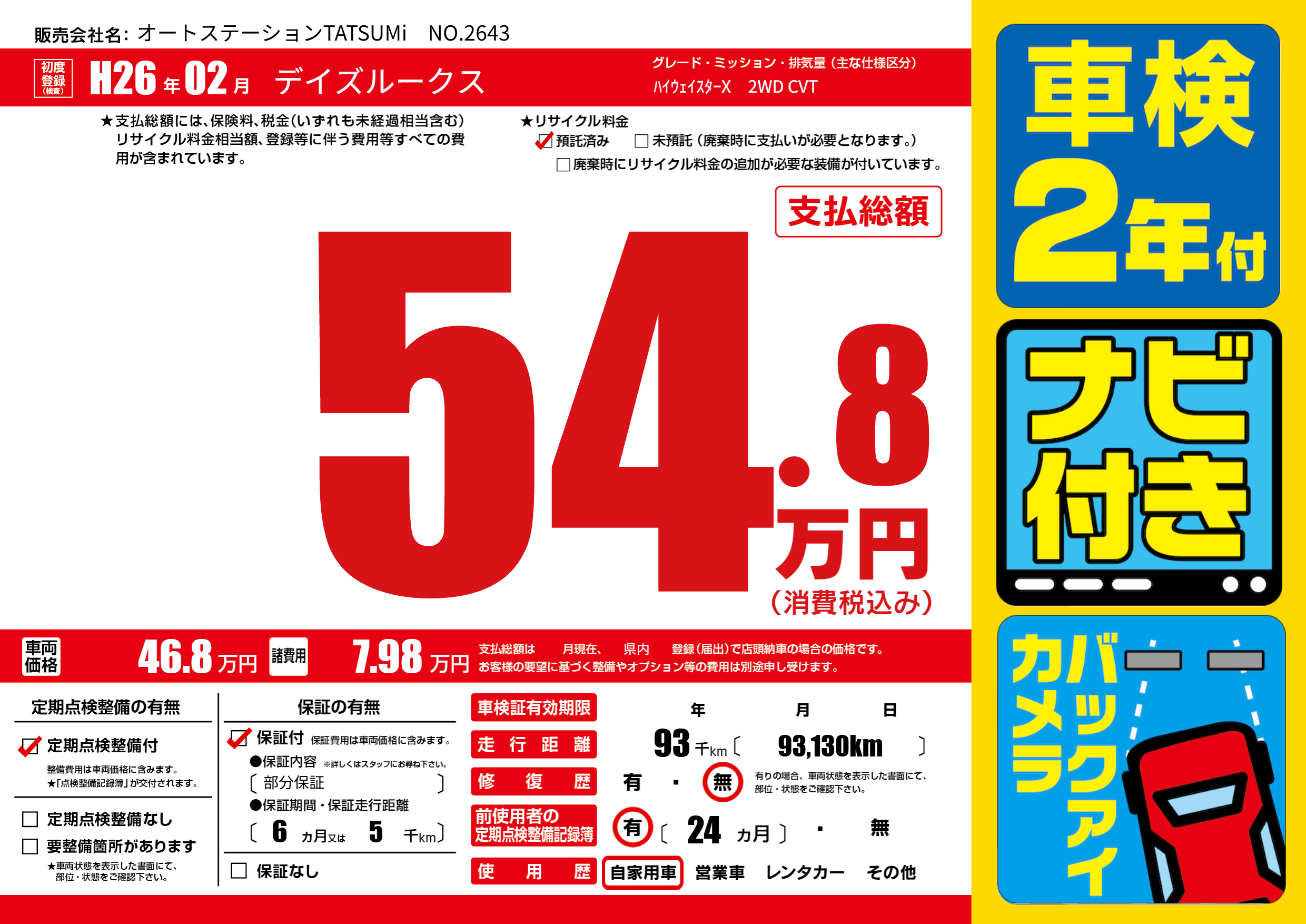| 走行キロ | 9.3万km | 初年度登録 | H26年02月 |