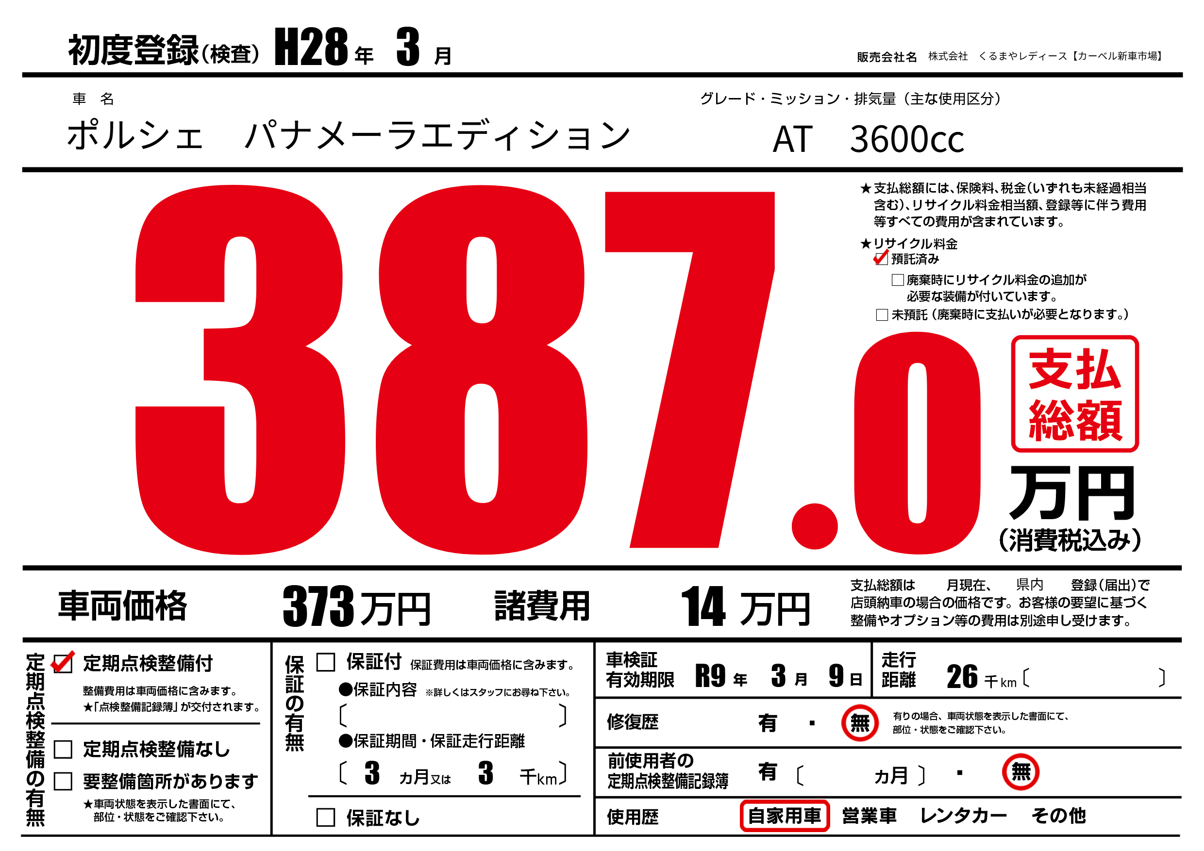 | 車名 | ポルシェ パナメーラエディション | グレード ミッション 排気量 |