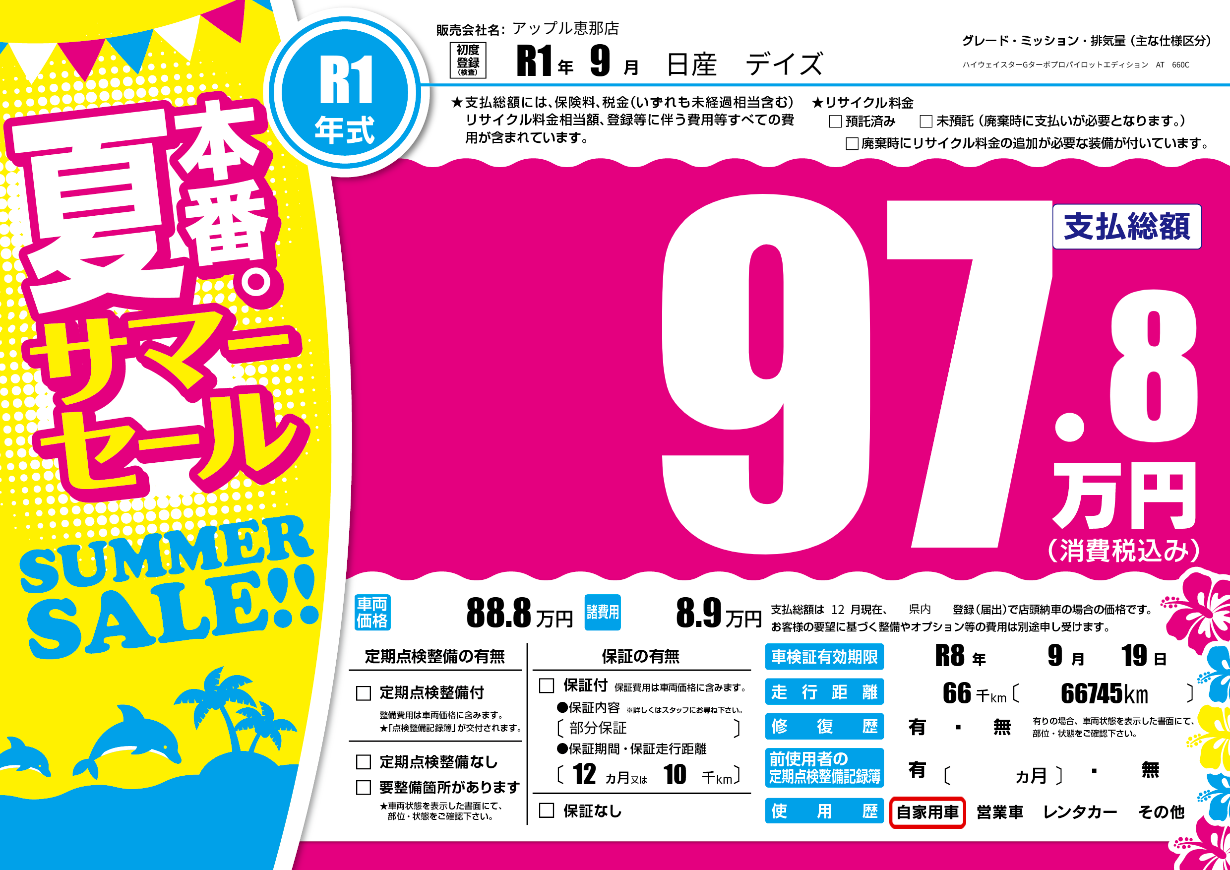 | 走行キロ | 6.6万km | 初年度登録 | R1年9月 |