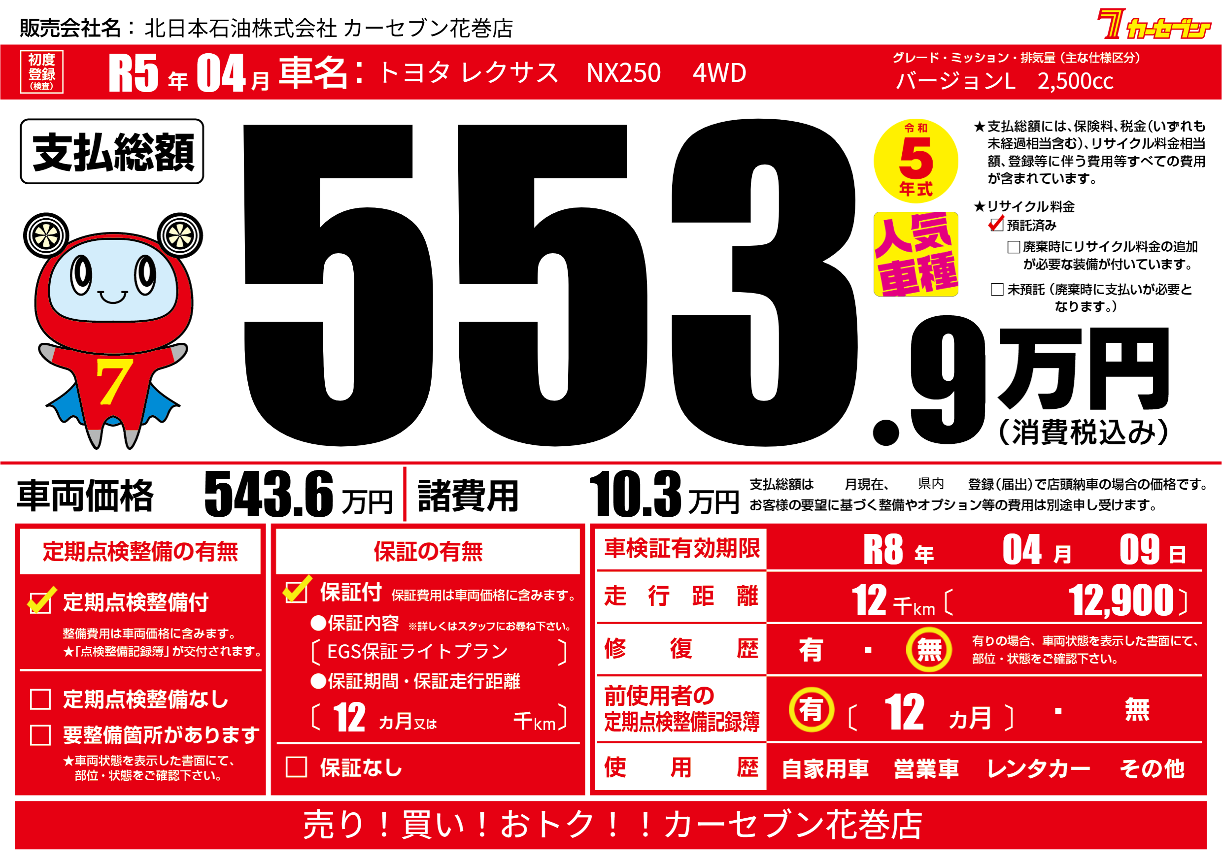保証付き 保証内容(EGS保証ライトプラン) 12ヶ月または()千kmまで |