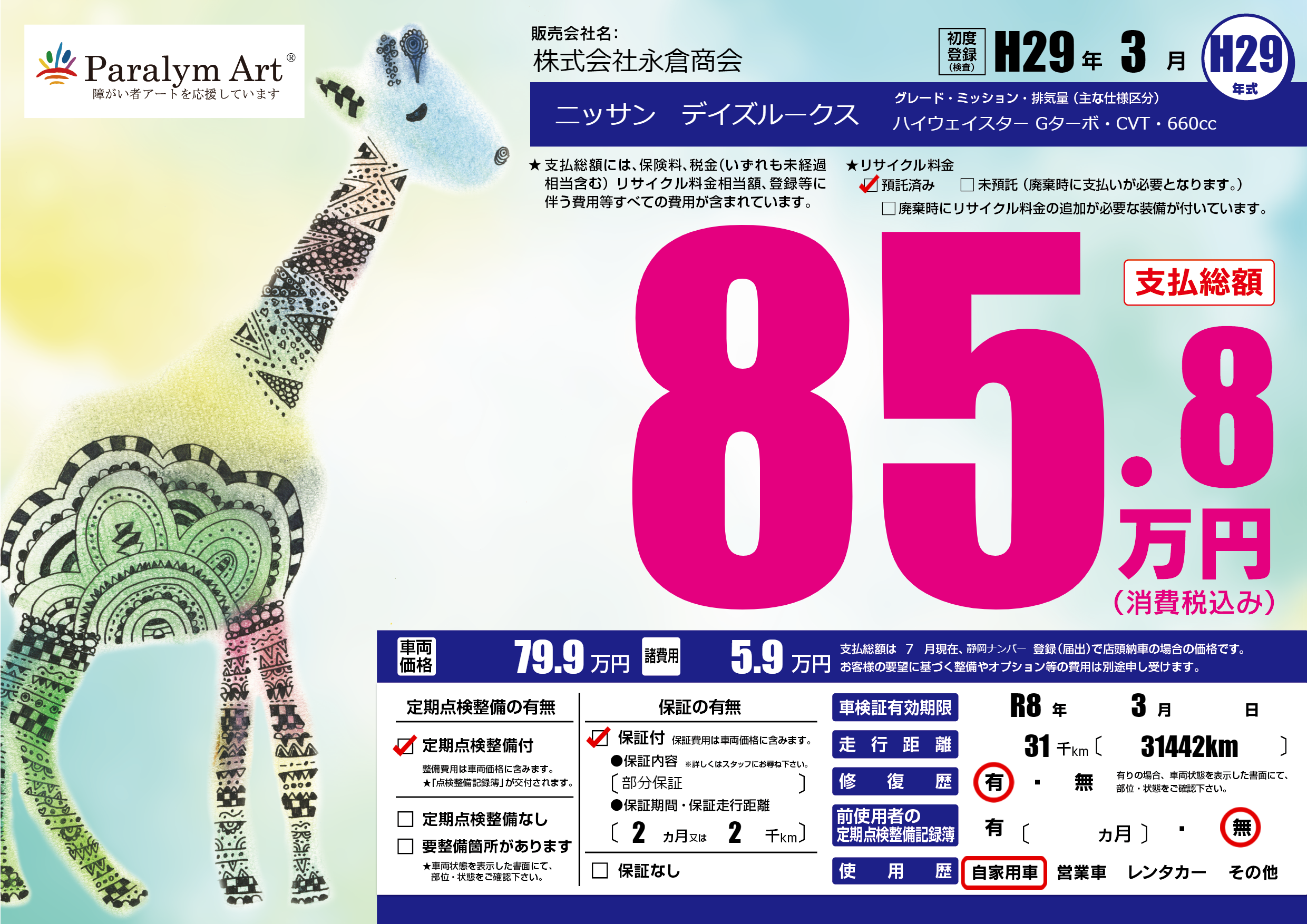 | 車名 | ニッサン デイズルークス | グレード ミッション 排気量 |