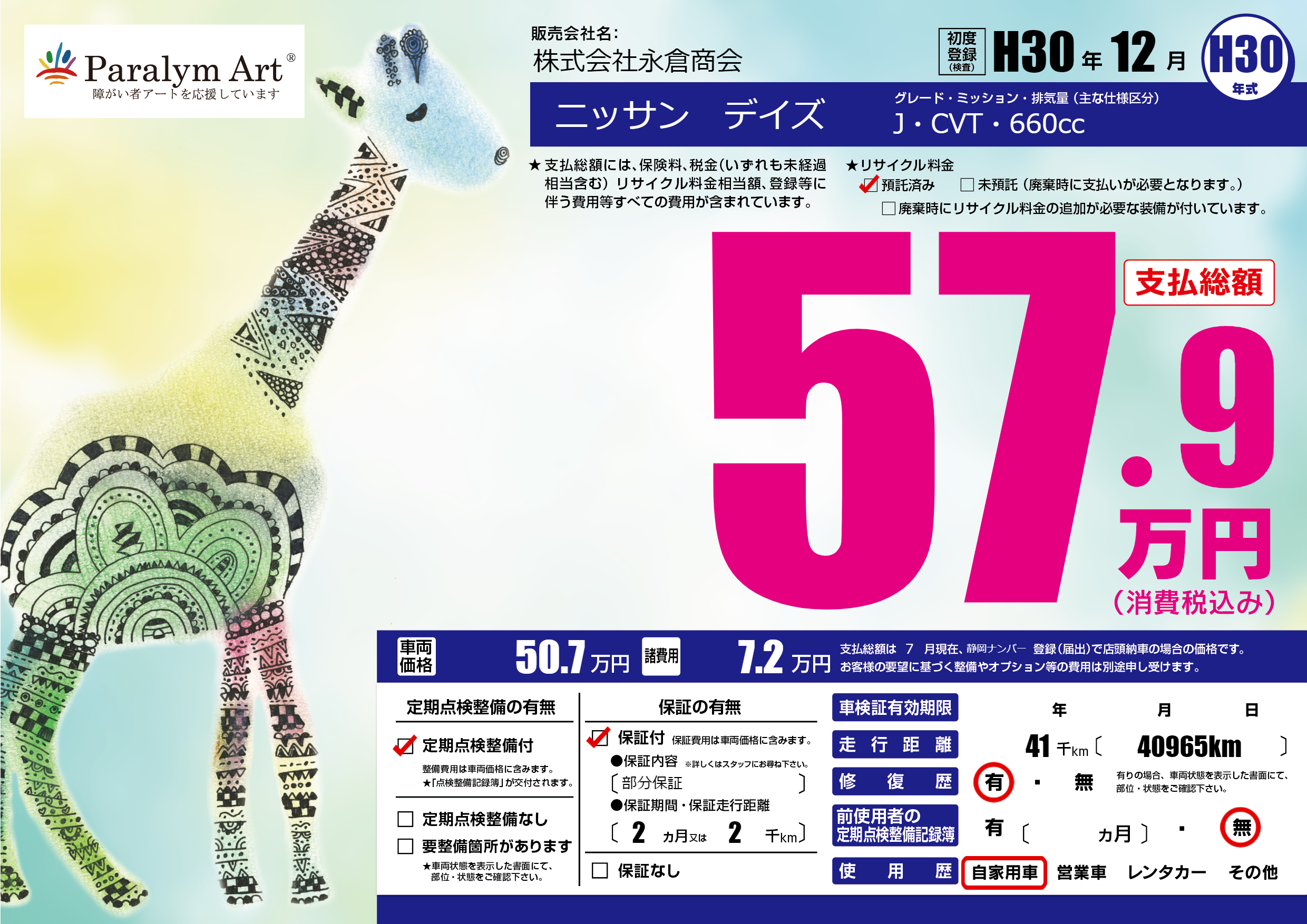 | 車名 | ニッサン デイズ | グレード ミッション 排気量 |