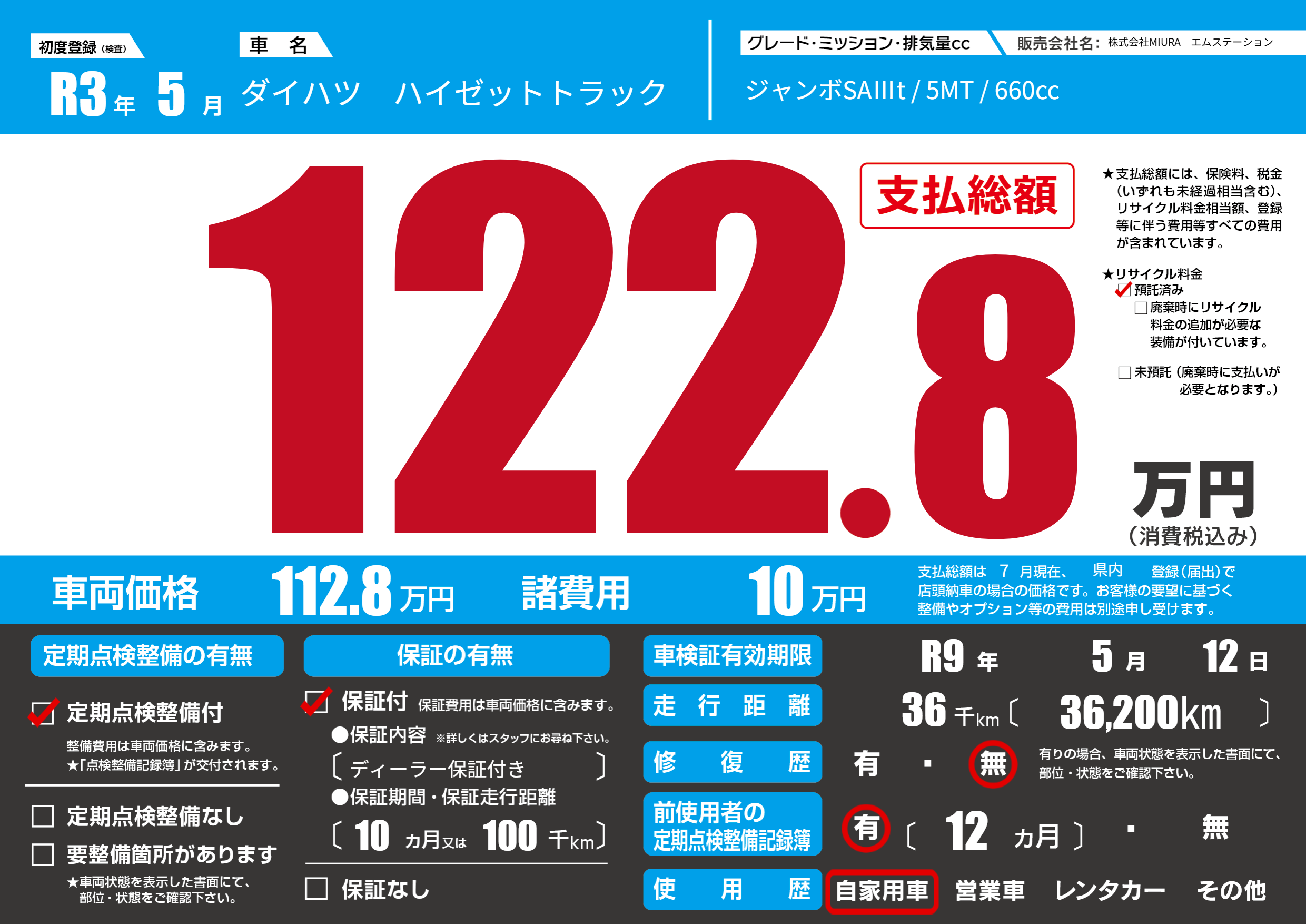 | 走行キロ | 3.6万km | 初年度登録 | R3年5月 |