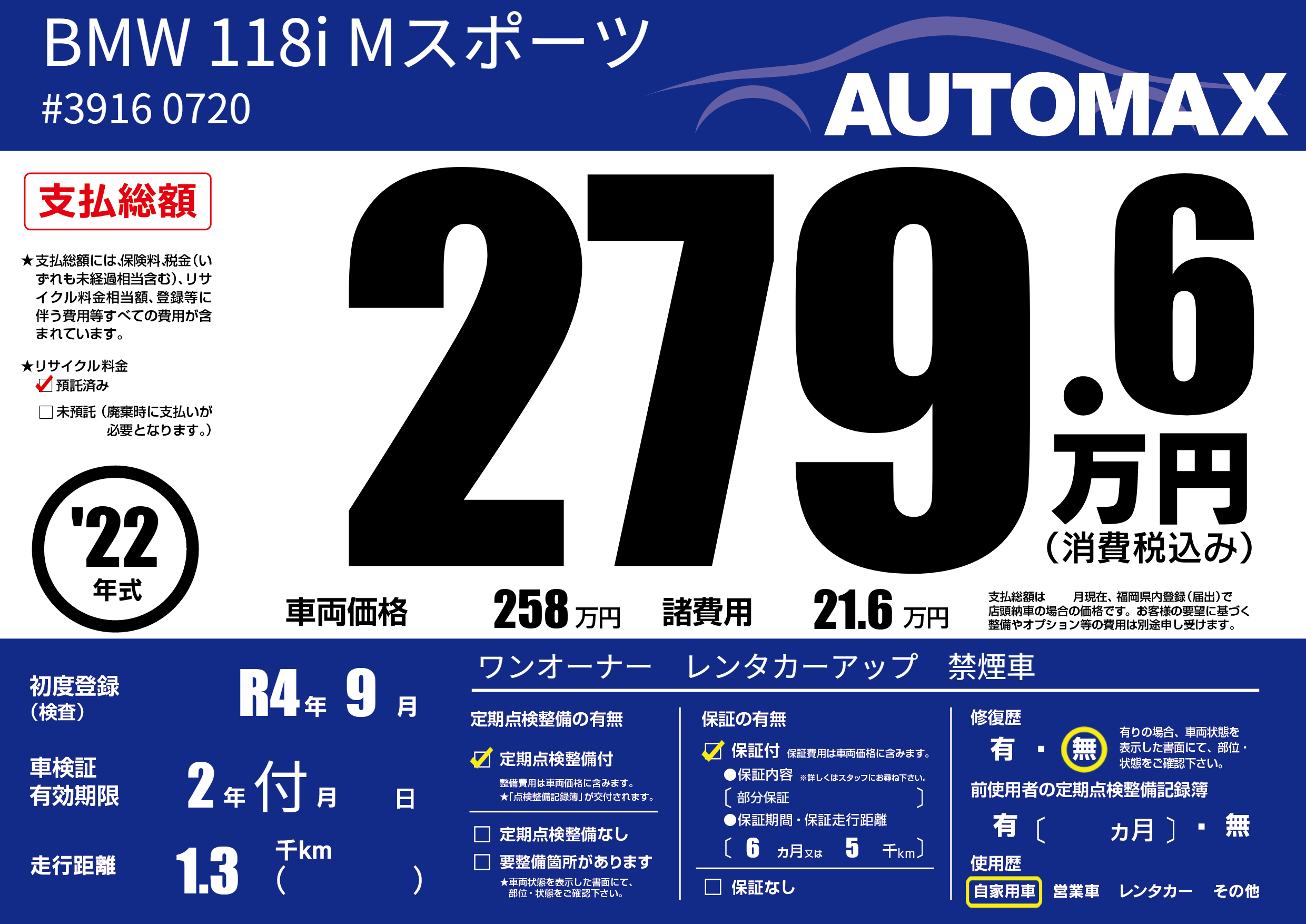 | 車名 | BMW 118i Mスポーツ | グレード ミッション 排気量 |