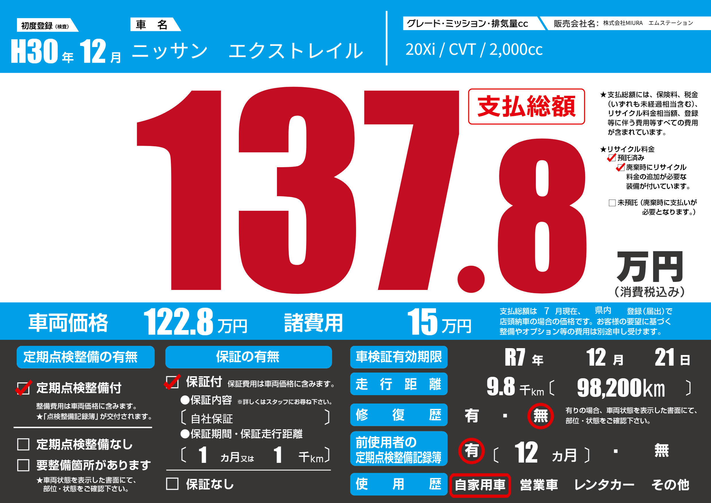 | 車名 | ニッサン エクストレイル | グレード ミッション 排気量 |