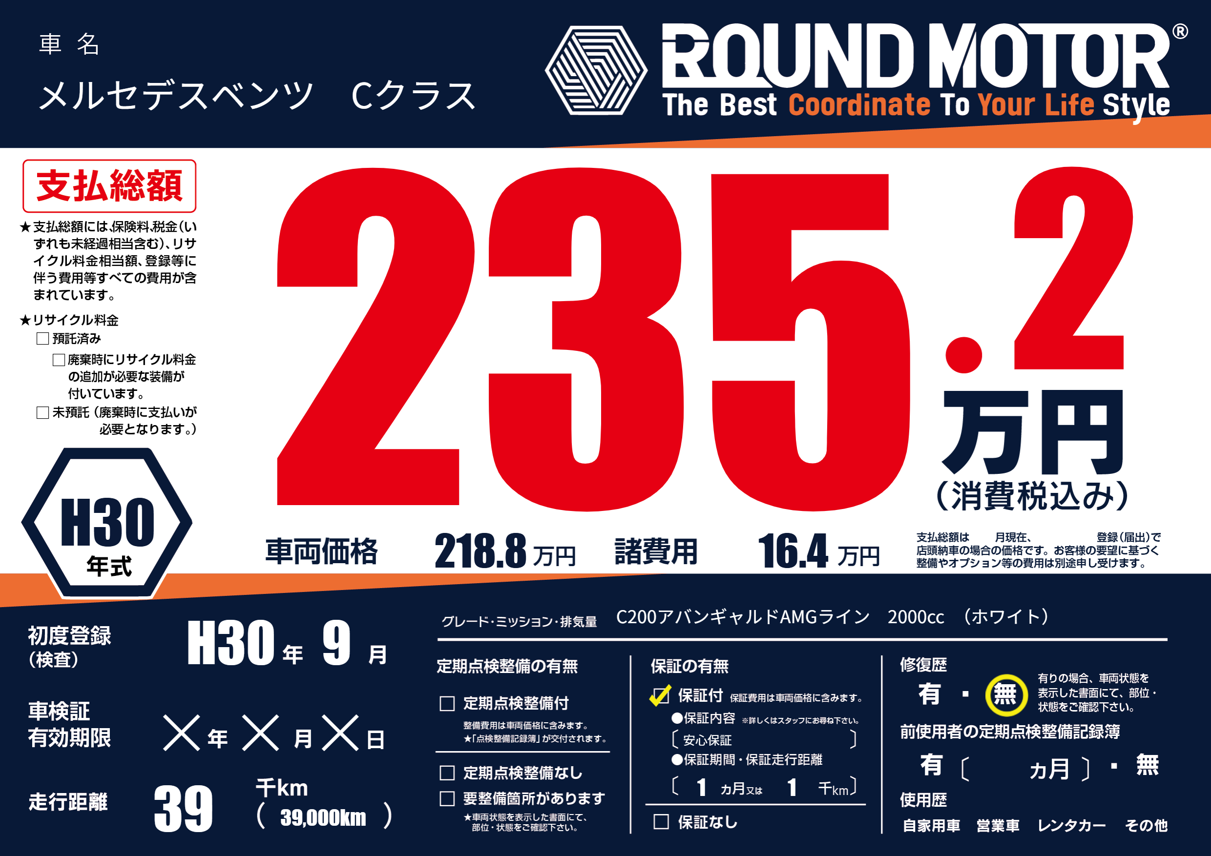 | 車名 | メルセデスベンツ Cクラス | グレード ミッション 排気量 |